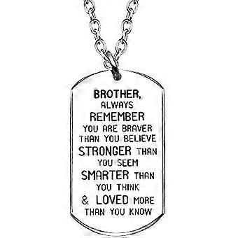 Perfect Gift: This is a great inspirational gift for your brother on Birthday,Christmas Day,New Year,or any time of a year. Unique Design: The dog tags necklace is very cool and fashion,designed for brother.The pendant is attached by stainless steel hoop,hardly to fall off.With lobster claw clasp and extension chain,it is easy to adjust the size of necklace,suitable for most of people.In addition, it has clear and meaningful words that Brother always remember you are braver than you believe,stronger than you seem,smarter than you think loved more than you know. Material:It was made of high quality stainless steelMeet rigid safety and nontoxic materials standard ,exquisite workmanship,comfortable to wear, ,no deformation,no rust,no fading. Size:Pendant size 4.7 cm or 1.85 inch,Chain Length 60 cm or 23.6 inch ,Weight 22 g. Package: Coming with 1 piece of necklace that will be well packaged in a free jewellery bag . This is a great inspirational gift for your brother on Birthday,Christmas Day,New Year,or any time of a year.The dog tags necklace is very cool and fashion,designed for brother.The pendant is attached by stainless steel hoop,hardly to fall off.With lobster claw clasp and extension chain,it is easy to adjust the size of necklace,suitable for most of people.In addition, it has clear and meaningful words that Brother always remember you are braver than you believe,stronger than you seem,smarter than you think loved more than you know. Jewelry: Necklace Color: Silver Material: Stainless Steel Size: Pendant size 4.7 cm or 1.85 inch,Chain Length 60 cm or 23.6 inch Weight: 22 g. Packing Include: 1 piece of necklace (free jewelry bag) Jewelry Maintenance: Avoid chemicals Avoid seawater Avoid wearing when taking a bath Avoid wearing when swimming Avoid wearing when doing the washing up Avoid wearing a lot of sweating Avoid wearing when sleeping Avoid impact Wipe jewelry with a soft cloth. If you have any questions about purchase or our products, please don't hesitate to contact us,we will spare no efforts to solve your issues. Thank you for choosing our products.