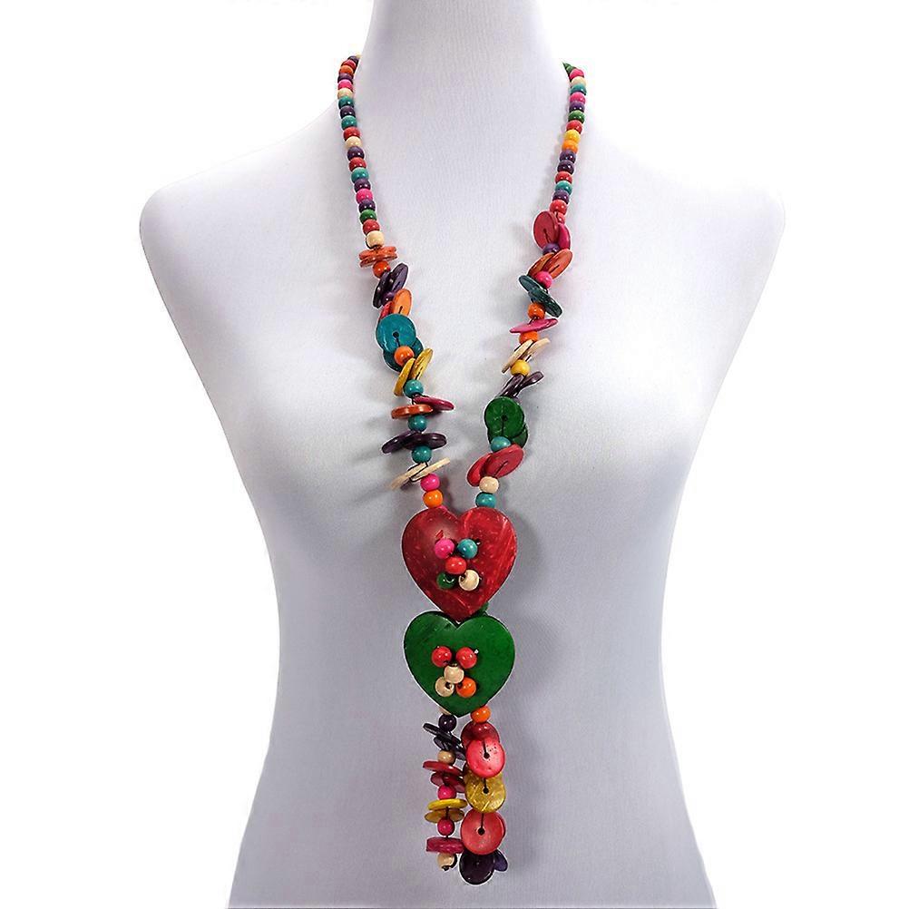 Women Handmade Necklace with Wooden Beads and Coconut Shell Heart Shape Pendant for Beach Jewelry