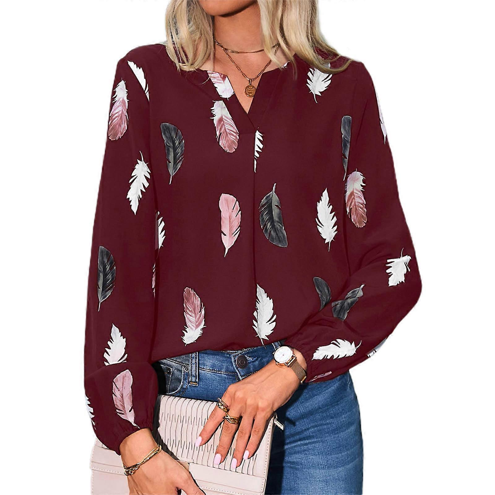 Woman V Neck Shirt Elegant Blouses for Shopping Long Sleeve Shirt Summer Spring Breathable Woman Feather Print Blouse Burgundy XL