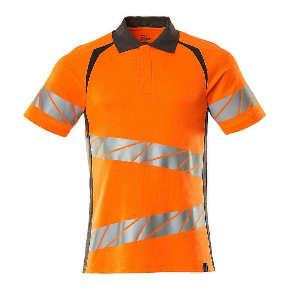 Introducing the Mascot Hi-Vis Polo Shirt 19083-771, Accelerate Safe, a premium addition to your safety wear collection. This two-toned, fluorescent polo shirt is designed with oblique, transverse reflective strips to ensure visibility in low light conditions. The modern fit combines a comfortable cotton interior with a durable stretch polyester exterior, featuring a unique square jacquard pattern. The elastic reflective strips, knitted collar, and placket with hidden buttons enhance both safety and style, while the neckband ensures a snug fit without compromising on comfort.