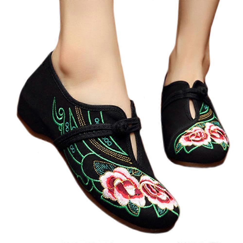 It doesn't pursue fashion but is unique;wear individual grade,conveny inner literary and freshness.Its vintage and fashionable emboridery and small peony and China flower pattern,black is sober and red is ardent;asymmetric edge design shows freedom and vintage;classic plate button design weaves unique smell. Delicate embroidery,colorful string overlap,juxtapose and intervain produces flamboyant but not vulgar color effect;the blent color of dark and light has Chinese painting's render effect;it uses top grade material,color is staid and simple,like go through time's baptism,showing perfect literary smell;it comforms to human engineering,it is comfortable and protects the feet. Wearing it is like going through thousand years time,eyesight like wave,smile like flower,moving step like lotus. Features: pure natural canvas,with little stimulus to the skin,abosorbs sweat and ventilate,is soft and close to the skin,super ventilated and super refreshing soft inner design,classic superior linen material,ventilate and is close to the skin vintage shoelace,elegant,beautiful and decent cotton string embroidery,perfect and delicate cowhell shoe sole,anti-skidding and comfortable,wear ressitant and durable Specifications: vamp material:cloth sole material:TRP(cowhells) inner material:cotton style:national fashionable element:low-cut,slipsole toe cap shape:round heel shape:low(1-3cm) heel height:slipsole opening depth:low-cut color:black,red size:34,35,36,37,38,39,40,41 weight:280g Size 34 35 36 37 38 39 40 41 Foot 215-220 220-225 225-230 230-235 235-240 240-245 245-250 250-255 keyword:old beijing cloth shoes,kid shoes,cloth shoes,embroidered shoes,cowhells sole