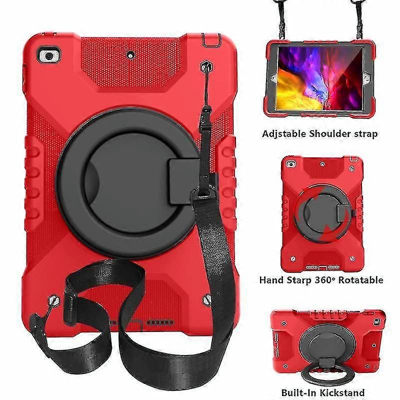 For Ipad 10.2 2021 / 2020 / 2019 Pc + Silicone Shockproof Combination Case With 360 Degree Rotating Holder & Handle & Shoulder Strap(red+black)