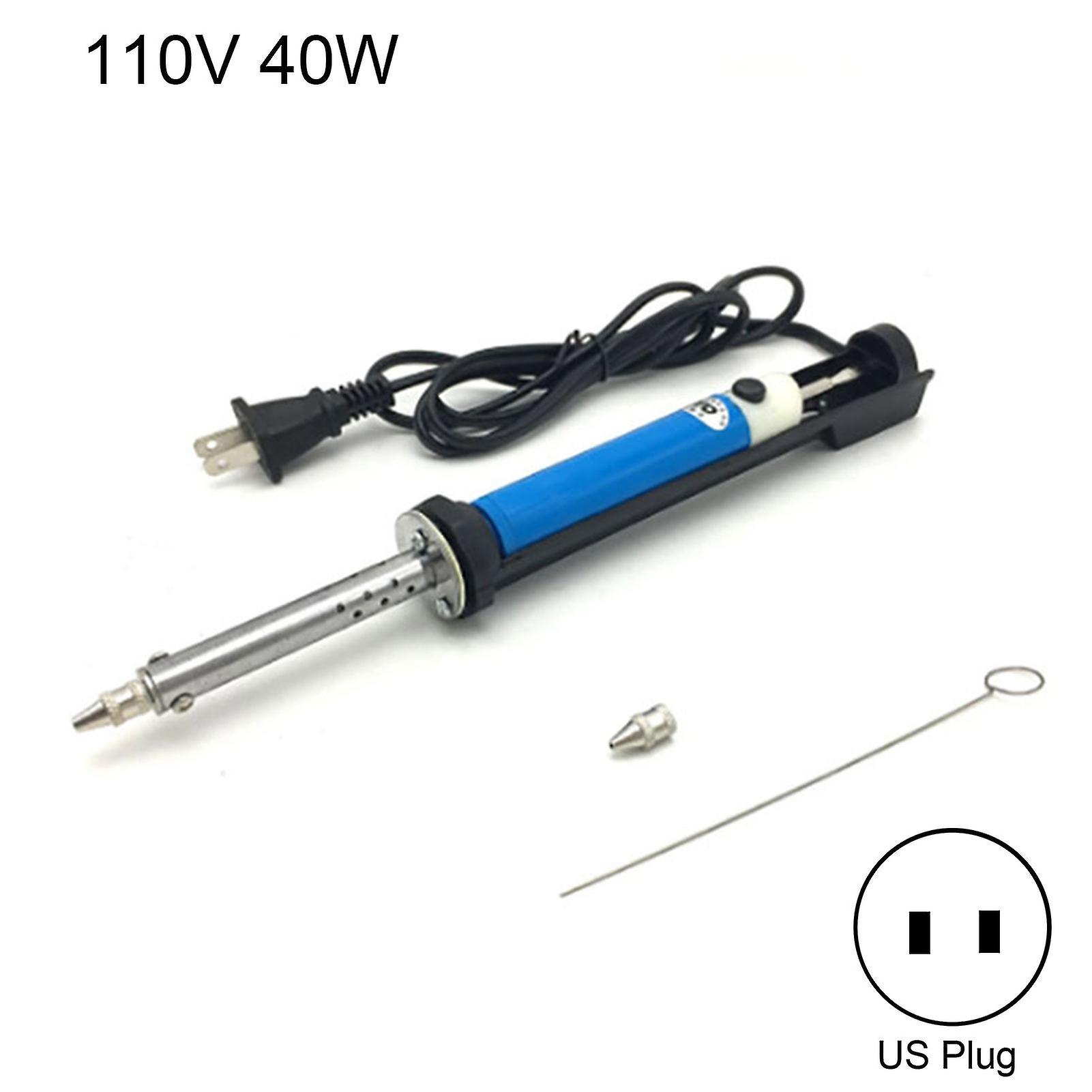 Description:Equipped with 2 tips of different diameter, this electric soldering iron can be used for various applications.High-quality inside components makes the electric soldering iron heat up quickly. And the temperature can be adjusted at will to meet different working requirement.With premium metal and silicone material, this electric soldering iron is practical and durable.This electric soldering iron is 26.5cm long and 2cm wide.It is widely used for electronics, welding, jewelry, guitar, watches, wiring, mobile device, computers hardware, small electronic work, TV capacitors or accessories, etc.Item Name: Electric Soldering IronMaterial: Metal,SiliconeTemperature Range: 200 Degree Celsius - 400 Degree CelsiusPlug Type: US/EU PlugSpecification: US Plug 110V 30W, US Plug 110V 40W, EU Plug 220V 30W, EU Plug 220V 40WSize Details: Size: 26.5cm x 2cm/10.43" x 0.79" (Approx.)Notes:Due to the light and screen setting difference, the item's color may be slightly different from the pictures.Please allow slight dimension difference due to different manual measurement.Usage: 1. Check whether the voltage used is consistent, too high or too low voltage is not conducive to use.2. Tighten the suction nozzle and the air cylinder before use to prevent air leakage, otherwise it will affect the tin suction effect.3. Frequently remove the solder impurities that enter the suction nozzle and the gas cylinder, and add a little oil to the piston.4. After each use, push the piston 3-4 times to remove the residual solder in the straw and make the nozzle and the straw unblocked for the next use.5. After the solder sucker is powered on, it is strictly forbidden to install and disassemble its electric heating parts.6. When the new solder sucker is used for the first time, it may slightly smoke due to the heating of the electric heating element. This is a normal phenomenon, and it will disappear naturally after ten minutes.7. During use, a soldering iron base with natural heat dissipation structure must be used and should be placed in the soldering iron base.8. If the power cord is damaged, in order to avoid danger, it must be replaced by the manufacturer or its maintenance department or similar professional personnel.9. This product has a ground wire, it should be used with a socket with contacts, please pay attention to use, to ensure safety.Connect to the power supply, preheat for 3 to 5 minutes, push down the piston handle, use the head of electric iron to aim the welding spot of the component, wait until the welding spot melts, then remove the control button,the soldering tin will be absorbed into the pump.Package Includes:1 x Electric Soldering Iron1 x PCB Needle Board1 x 1.4mm Tip1 x 2.0mm Tip