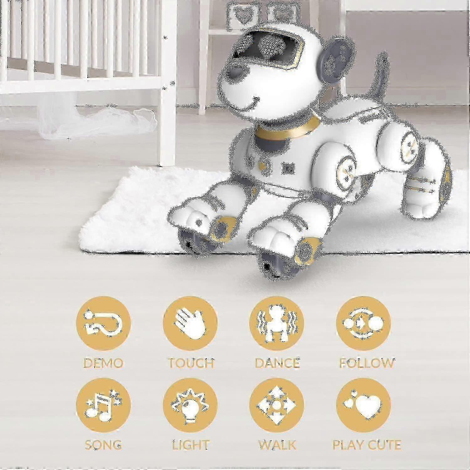 SMART INTERACTIVE ROBOT DOGThe robot dog toy will attract your attention like a real dog.If you touch it,the electronic dog will respond you by voice and actions.INTELLIGENT PROGRAMMABLE TOYYou can program the robot dog to perform according to your demands and then it will play back your demand like forward, backward, left, right, follow, etc.It's will help your kids use their imagination and creativity to practice simply programmingUPGRADE STUNT DOG TOYPress the command button of the controller, the smart robot dog will make many stunt actions such as say hi to you and sit down,handstand,rotate,flip,push ups by your struction. Meanwhile, We also add some extra functions like the following mode and stop button. which aim to provide you with more fun and convenience.DANCING & SING ROBOT DOGThe robot dog has the skills of singing and dancing, with original design of exclusive stunt music and dance,bring fun with kids boys girls.What Will You Get:1x Robot toy, 1 x Controller, 1x Instruction manual, 1x USB cable, 1x Screwdriver.Our Smart Robot Dog Dubbi is an ideal Christmas gift for boys and girls, accompany your kids to grow up, this lovely dog toy as a great playmate for your kids to learn and play at the same time.<br> Note: Due to the light and screen setting difference, the item's color may be slightly different from the pictures. Please allow slight dimension difference due to different manual measurement. Sold by-DIMEANI official store