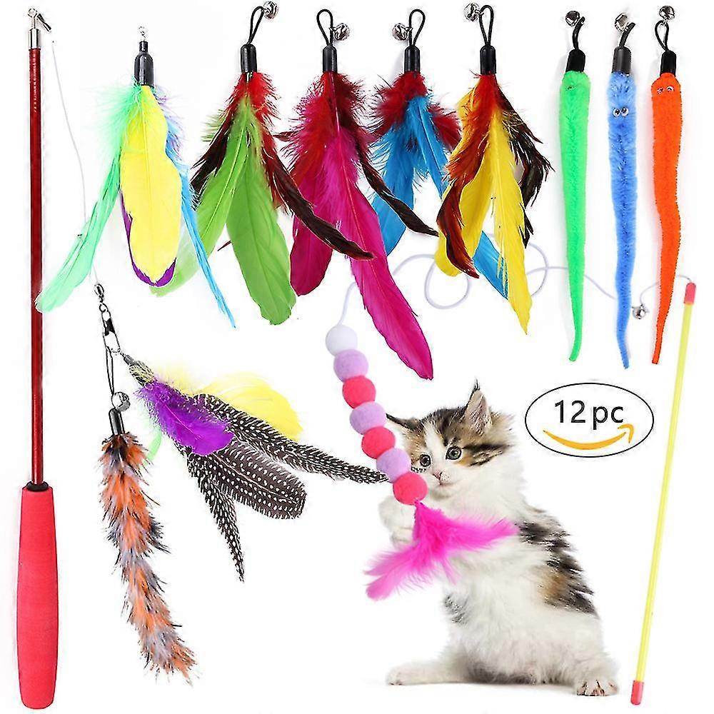 Interactive Retractable Cat Toy,magic Wand With Teaser Wand,12 Cat Fishing Rod Replacement Feathers With Pendant Spring Bell Attachments Worm Cat Blue