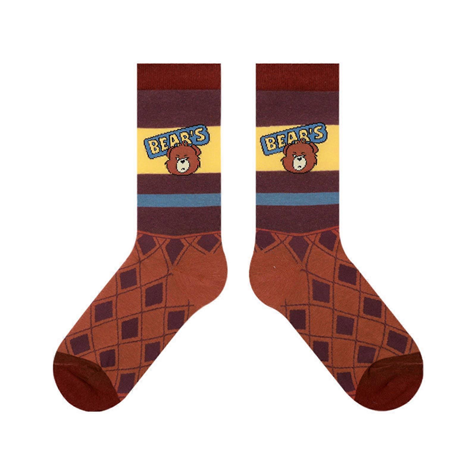 Unisex Cotton Crew Socks Contrast Color Striped Bear Print Skateboard Hosiery