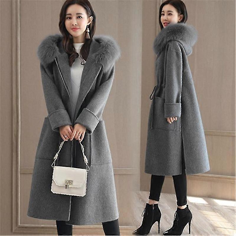 Luxora Women Woolen Jacket With Fur Collar Hooded Long Coat Plus Size Winter