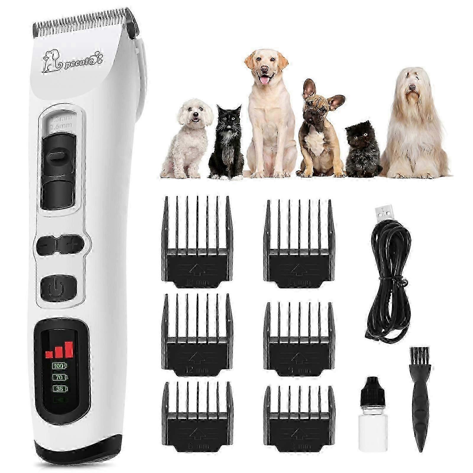 Product Benefits of Regular Pet Hair Trimming 1. Extra hair can make it difficult for dogs to move, and removing old hair can reduce bacteria in the coat. 2. Regular shaving can reduce the risk of heat stroke in the summer. 3. Pet hair often falls all over the house, regular trimming can relieve the owner of allergies caused by accidental hair absorption. The best for your pet! We continuously develop and design new products to enable owner and pets to have a better life! We are committed to; do our best to resolve any issues you may have. Professional Dog Clipper :Pecute Product net weight: 294 g Product power: 10 W Battery type: lithium battery Package Included: Electric Clippers*1, USB charging cable*1, empty oil bottle*1, brush*1, limit comb*6 Why Choose Dog Cat Clipper? Powerful DC3.7V Motor and High Quality Brass Shaft with Low Noise of 60db Long life -Charging for 3 hours, working for 4.5 hours Smart LCD Display -Current speed and remaining charge can be displayed Adjustable Ceramic Blade -more expensive and won't dull as quickly as regular blades