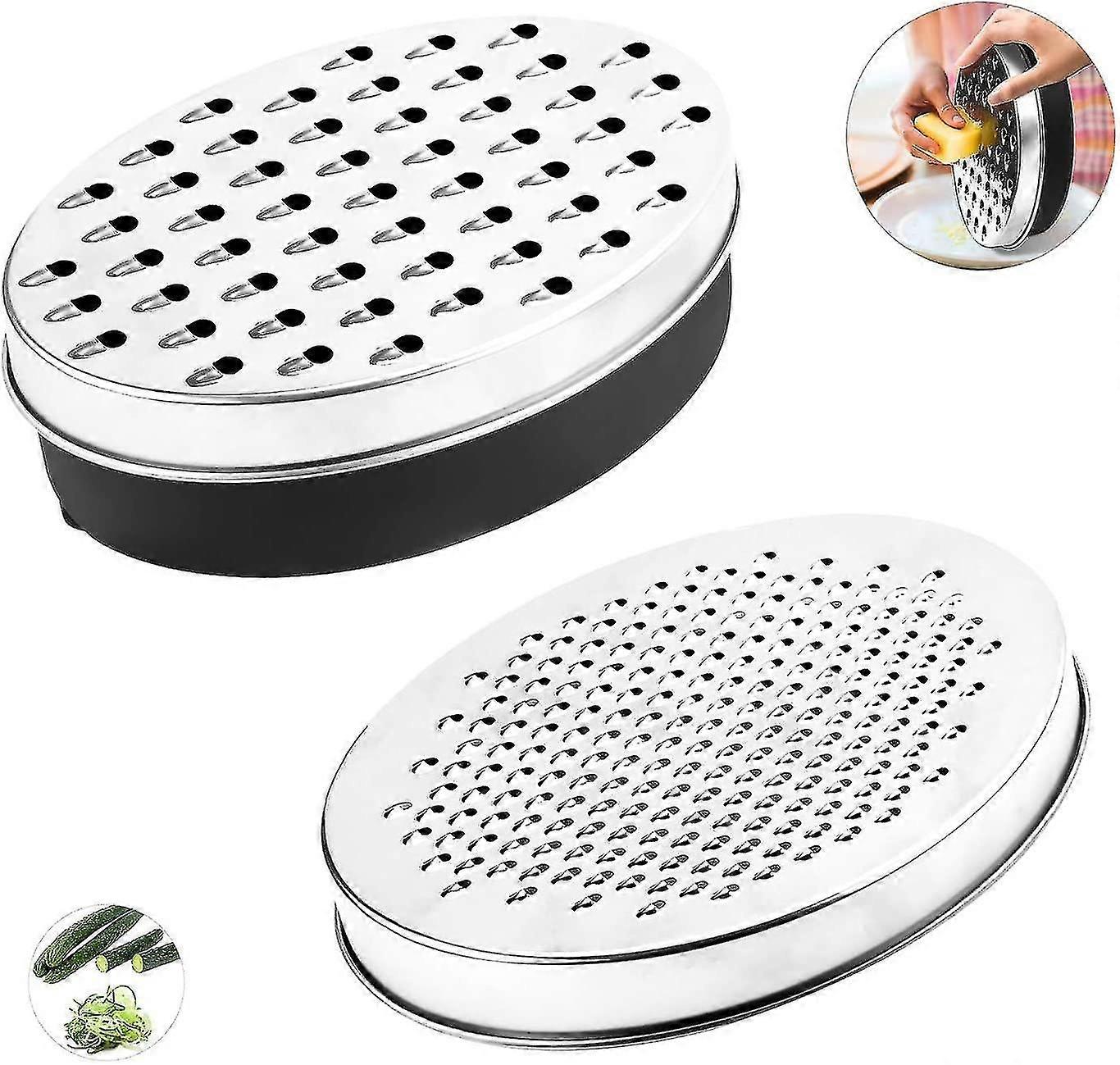Multifunction rpe 2 in 1: Our cheese grinder comes with two types of stainless steel grid covers that can meet both thick and fine grating needs. Fine grater - used to grind lemon, apple, orange and a variety of fruits as well as ginger, garlic, nuts, chocolate and many spices. Coarse grater - used to grind potatoes, cucumbers, carrots and other vegetables and fruits to make a salad or to cook.2 stainless steel blades with storage container: The cheese grinder consists of a stainless steel blade and a PP storage container. There are 2 planks which can meet the needs of thick and thin gratings. And PP storage container with non-slip base to hold food for mess-free grating, with tightly fitted snap-on lid, adults and children can easily use it.Easy to use: Non-slip base design that adults and children can easily use and safely. Just put the food on the stainless steel blade and scrub it, and the storage box can hold the food well without splashing all over the place. save your cooking and cleaning time.Easy to clean: You can put the vegetable chopper in the sink and rinse it out quickly. Comes with a small brush for easy cleaning. The storage container also prevents food from spilling out, allowing you to reduce cleanup. It's also dishwasher safe, you can throw our cheese grinder in the dishwasher for a quick cleanup.Premium material: Our cheese graters are adopted with food grade 430 stainless steel, which is safe, durable, rustproof and durable. Compared to other products, our grinder has a longer service life. The PP storage container will not be easy to break or deform. The airtight seal helps foods retain their flavor and flavor longer.