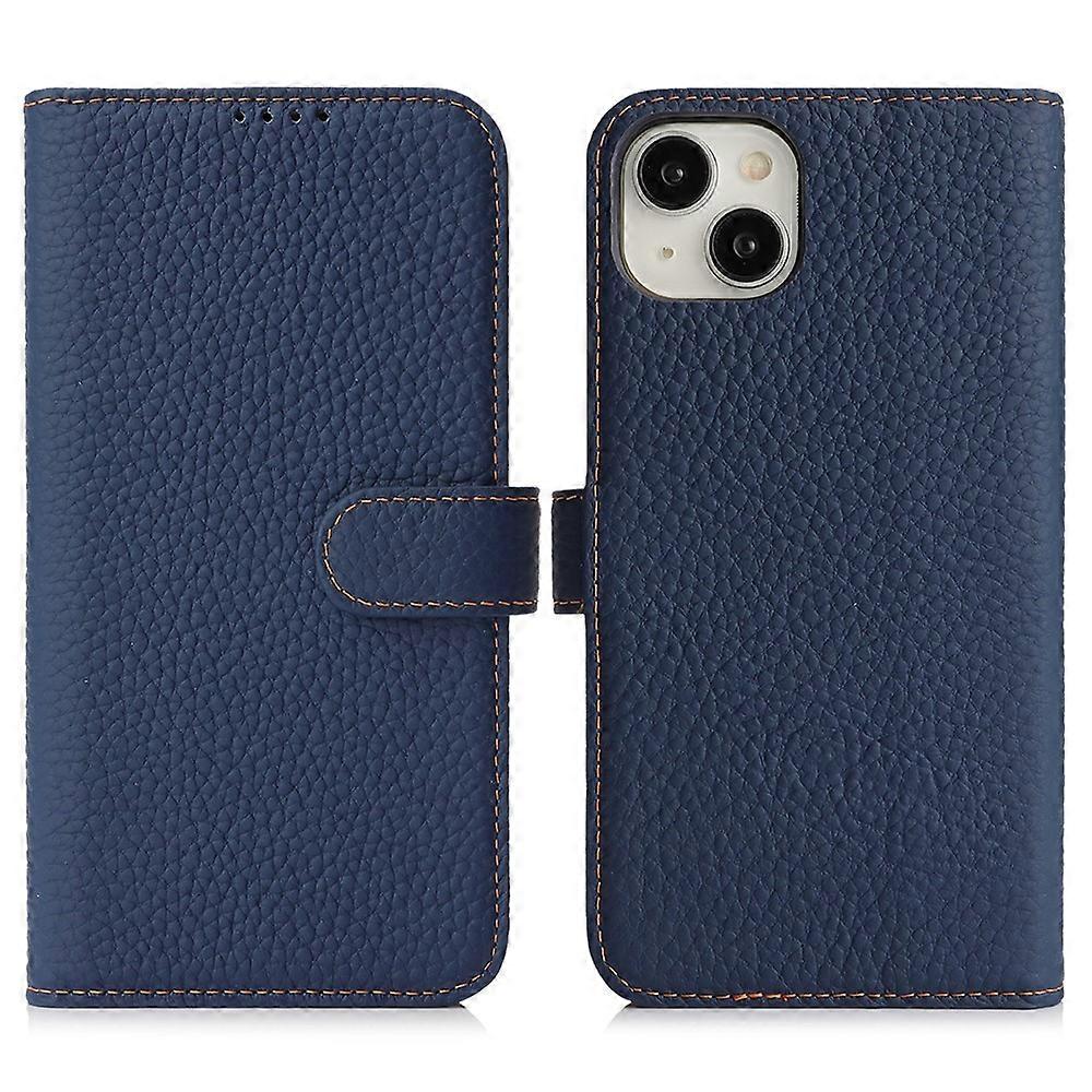 Compatible For iPhone 15 Plus / 14 Plus Stand Case Litchi Texture Genuine Cow Leather Wallet Phone Cover RFID