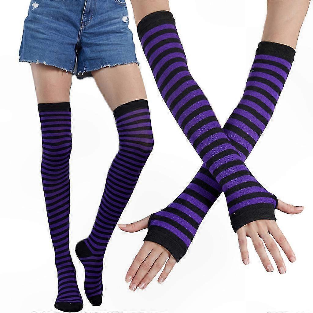 Multicolored Striped Thigh High Socks and Arm Warmers Set for Women Winter Knitted Over Knee Stockings with Fingerless Gloves Red Green