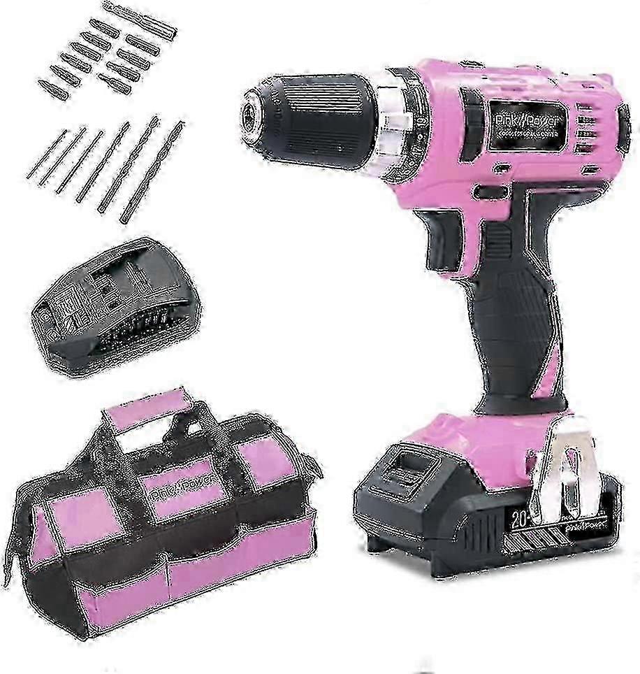 Cordless pink power drill set : Each Pink Power drill driver toolset includes (1) 20-volt cordless drill, (1) 1.5Ah lithium-ion battery, (1) fast charger, a 16 piece drill bit set, a 13" nylon tool bag, and a full 3-year warranty. Lightweight Electric Drill Driver: This 20V electric cordless drill weighs under 2.9lbs with the battery, making it lightweight and easy to maneuver. It also includes a belt clip to keep your hands free. Fast charging battery: Each 20V battery charges in less than an hour and includes an LED power gauge so you won't be surprised by a low charge. This battery is compatible with Pink Power's 20V tools including the PP204 Sander and PP201 Vacuum. Automatic LED work light: The PP203 cordless drill includes a trigger-activated LED work light, making it great for dark and cramped workspaces. Use it to update cabinet hardware, hang a picture, replace drywall and so much more. Dual-speed settings for any project: The PP203 power drill includes 2 speed settings giving you more control (0-350RPMs and 0-1,350RPMS). Your drill also includes 19 torque settings (up to 225 in-LBs) to help with any project. Whether you're a professional or buying your first power tool, this lightweight yet powerful cordless drill will help you tackle your next project. Each power drill kit has a 20V battery, charger, 13" nylon tool bag, and both screwdriver bits and drill bits that work for most DIY applications.