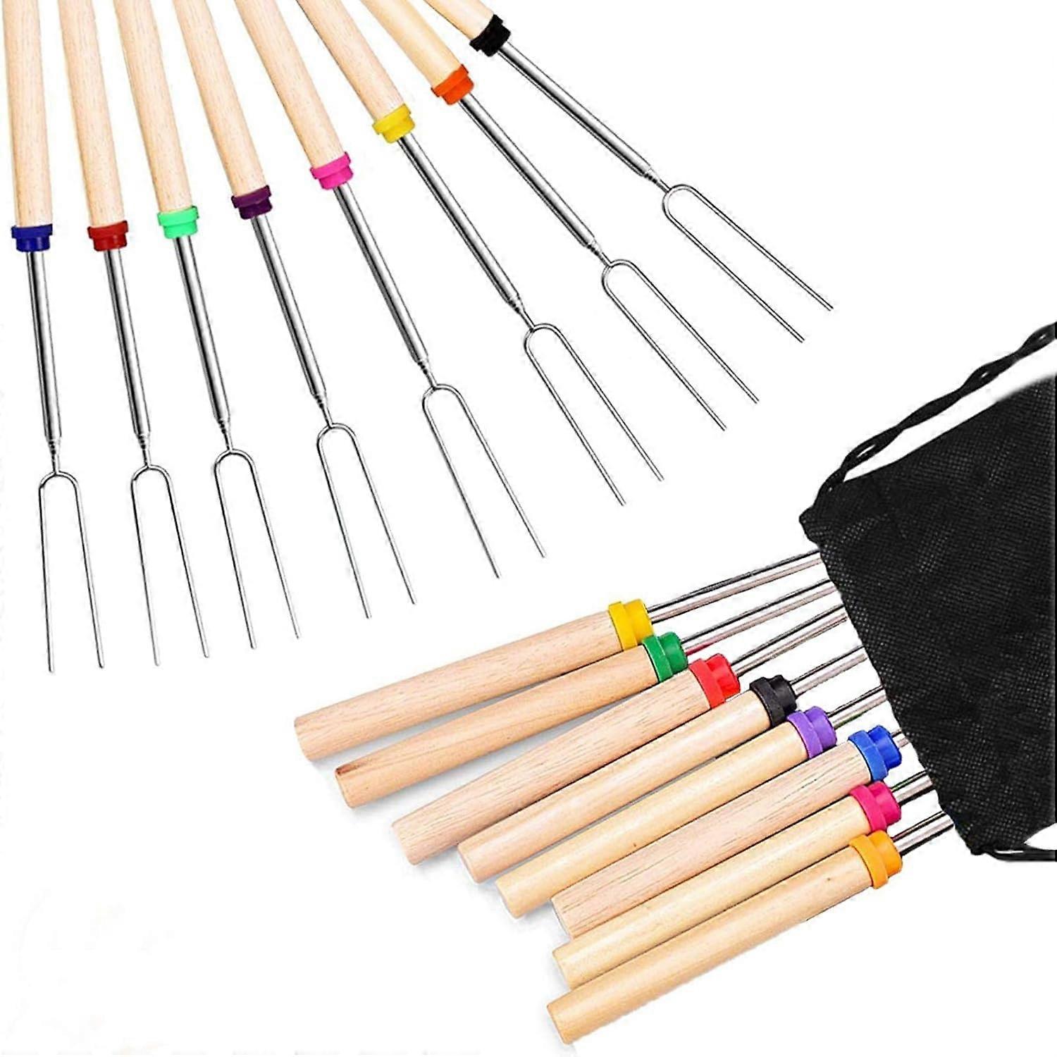 Barbecue Forks Set of 8 Marshmallow Roasting Sticks Extendable Stainless Steel 32 Inch U Shape Hot Dog Fork with Wooden Handle Grilling Skewers for Ca