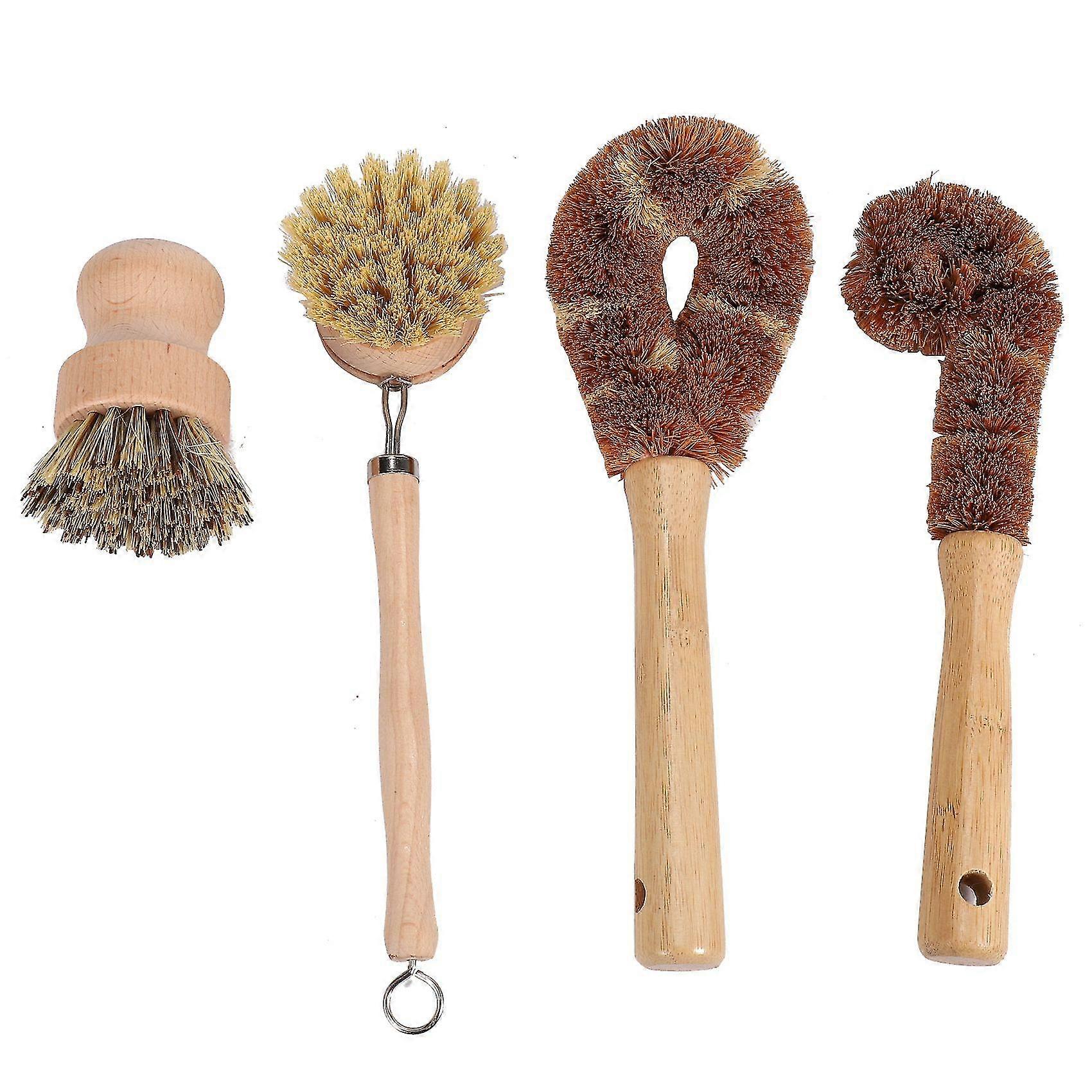 Plant Based Cleaning Brush Set 4 Piece, Beech Wood And Coconut Bristle Wooden Pan And Pot Cleaning