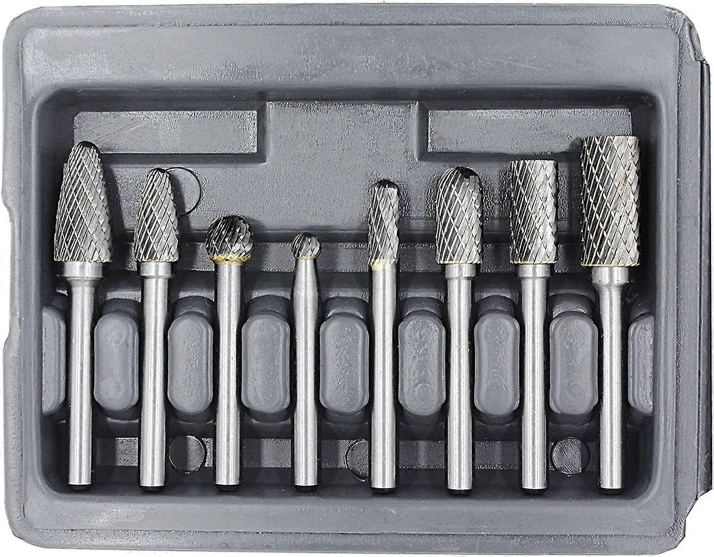Quantity8pcs Carbide Rotary Burr Set, 1/4 inch shank , fits most Rotary Die grinders DurableMade of heat-treated tungsten carbide that hardness can reach to HRC70, sharp and sturdy VersatileWidely used for metalwork, tool making, model engineering, wood carving, jewelry making,welding, chamfering, casting, deburring, grinding, cylinder head porting and sculpting TargetSuitable for all skill levels: this is a essential kit for woodworkers enthusiasts who cleans up welds or works with metal frequently, easy to grasp and use, safe and reliable ProtectiveShapes included : SA, SC, SD, SL,SF. Packed with a nice plastic case for safety storage and protection Made of heat-treated Solid tungsten carbide YG8 that lasts 8 times working life Durability than HSS tool Our Double Cut Carbide Burrs tend to be used on ferrous and non ferrous metals, aluminium, soft steel and also for all non-metal materials such as plastics and wood. They have more cutting edges and will remove material faster. Double cut will leave a smoother finish than single cut due to producing smaller chips. Use for medium-light stock removal, deburring, finishing and cleaning. A double cut carbide burr is the most popular cut and will see you through most applications. The product has excellent quality, long life and good cutting performance. It can process a variety of materials economically and efficiently to achieve the desired effect. Tips: Always ensure your burr shank is well inserted into your collet andclamped down tightly Wear an eye mask to protect your eyes from filings Ensure the appropriate Air Tool is used and that it is regularly maintained Check that the bur is running true in the Air Tool before use Generally, the minimum grip depth is 2 / 3 of the length of the handle (not suitable for long handle rotary files) Run extra long burs at slower speed, do not exceed 15,000 RPM Use a smooth cutting action with constant movement. Use light pressure, let the bur do the work Keep out reach of children Size: : 142mm*110mm*25mm Color: silver Products include: 1* tungsten steel grinding head