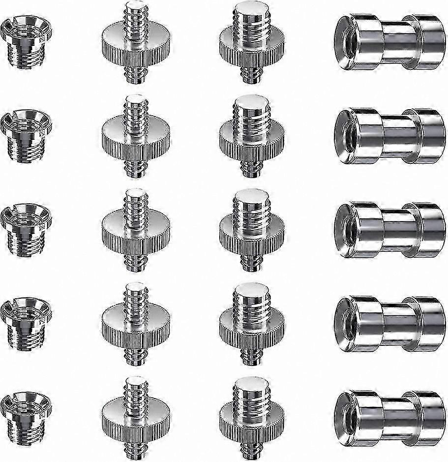 LEIGAO Precision Design - 1/4" male to 1/4" male camera screw adapter, 1/4" male to 3/8" male screw adapter, 1/4" female to 3/8" male threaded screw, and 1/4" female to 3/8" female adapter. Durable Material - The 1/4" female to 3/8" female camera mounting screw adapter is made of aluminum alloy; other adapters are made of stainless steel. Solid and durable with a silver color finish. Multifunctional - These converter screws accommodate most camera devices and accessories, enabling greater rig configuration possibilities and flexibility during photography. Economical and Practical - This complete set of screws can be used individually or together to allow seamless conversion between 1/4" and 3/8" standard screws or interfaces. Color: As shown What You Get: - 5 x 3/8" male to 1/4" male adapter - 5 x 1/4" female to 3/8" female adapter - 5 x 1/4" male to 1/4" male adapter - 5 x 1/4" female to 3/8" male threaded screw Specification: Product Name: 1/4 Inch and 3/8 Inch Standard Screw Adapter Set Material: Aluminum alloy and Stainless Steel (metal) Package Size: 8.5 x 5.5 x 3.5 cm Total Weight: 150g Product Use: Enables free conversion between 1/4 inch and 3/8 inch standard screws or interfaces 20 Pcs Camera Screws Pack: - 5 Pieces 1/4 inch to 3/8 inch male threaded screw adapter - 5 Pieces 1/4 inch to 1/4 inch male threaded screw adapter - 5 Pieces 1/4" female to 3/8" female screw adapter - 5 Pieces 1/4 inch female to 3/8 inch male screw adapter