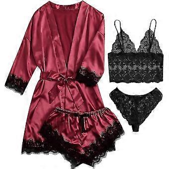 Silk Satin Sleepwear Set for Women 4pcs Cami Pajamas with Lace Trim and Robe