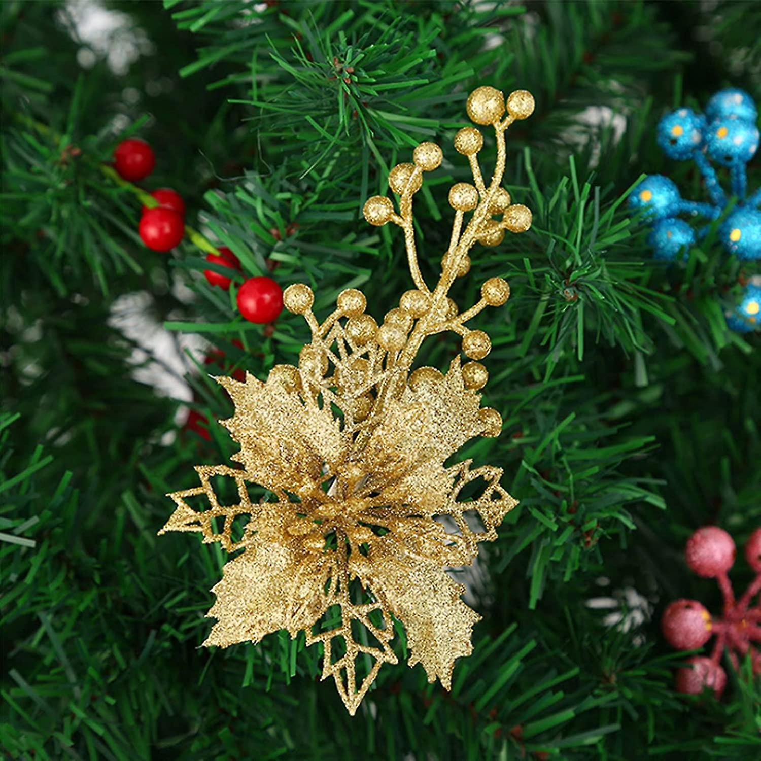Set Of 10 Christmas Decoration Artificial Poinsettia With Metal Alloy Clip 15cm Glitter Christmas