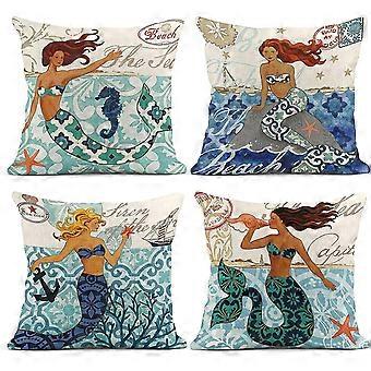 Set Of 4 Throw Pillow Covers Summer Ocean Theme Nautical Coastal Mermaid Mediterranean Style Navy Decorative Pillow Cases Home Decor Square 18x18 Inch