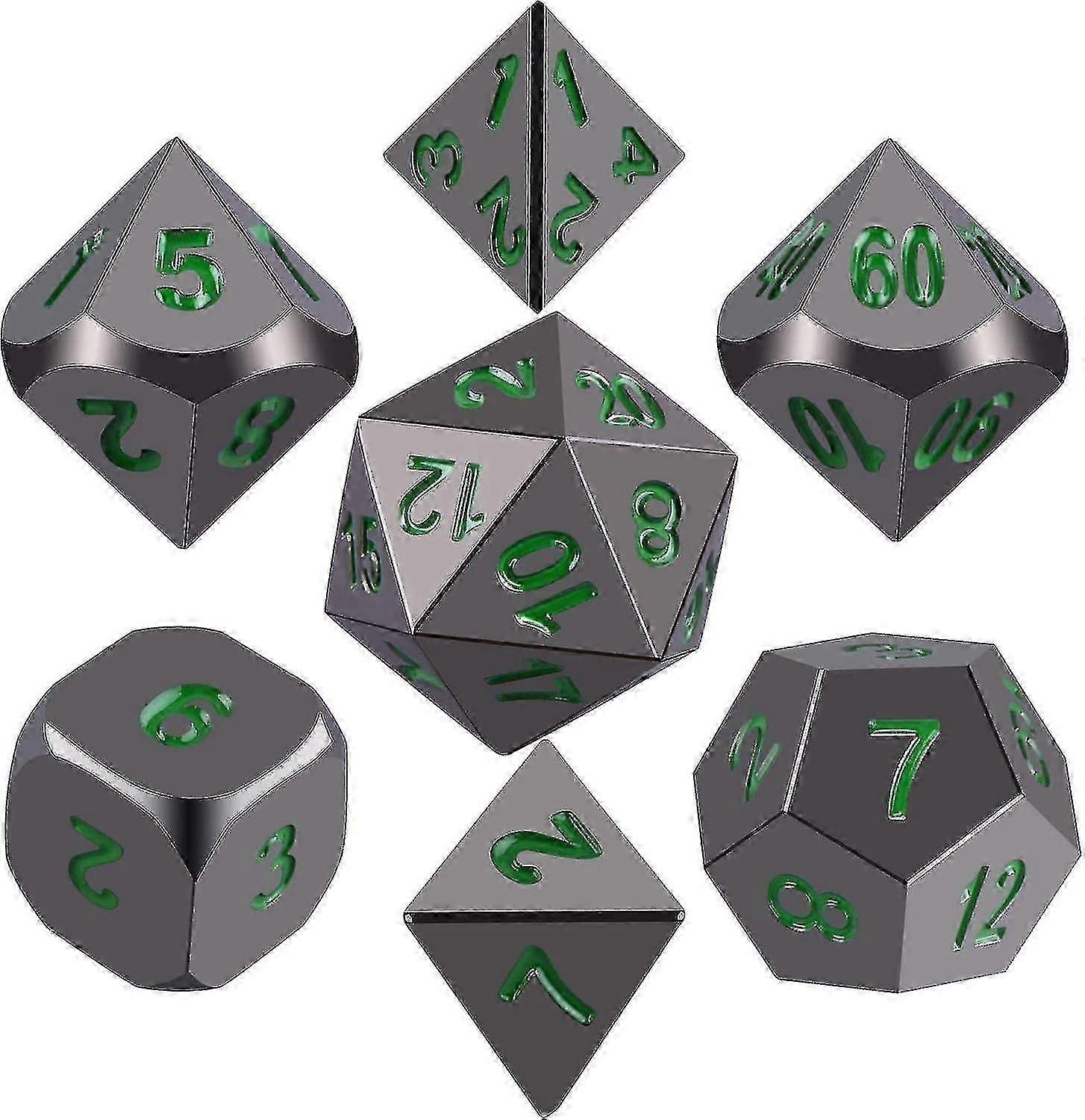 Metal Polyhedral 7-Die Dice Set, Negro Brillante Pintado Y Nmeros Verde Oscuro Zinc Aleacin Dice Con