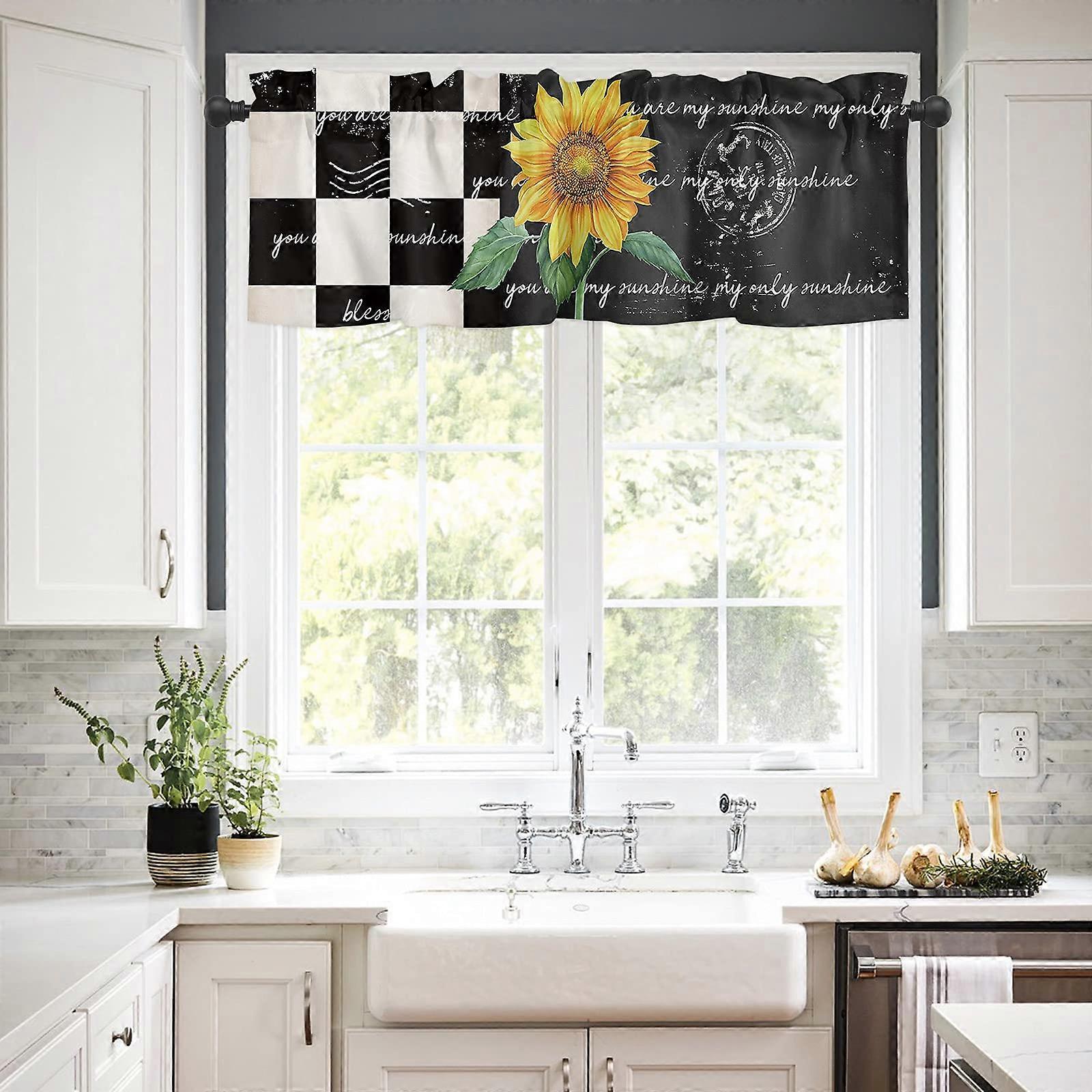 Farm Yellow Sunflower Curtains Short Size Black and White Checkered Floral Art for Kitchen Living Room Bedroom Decor