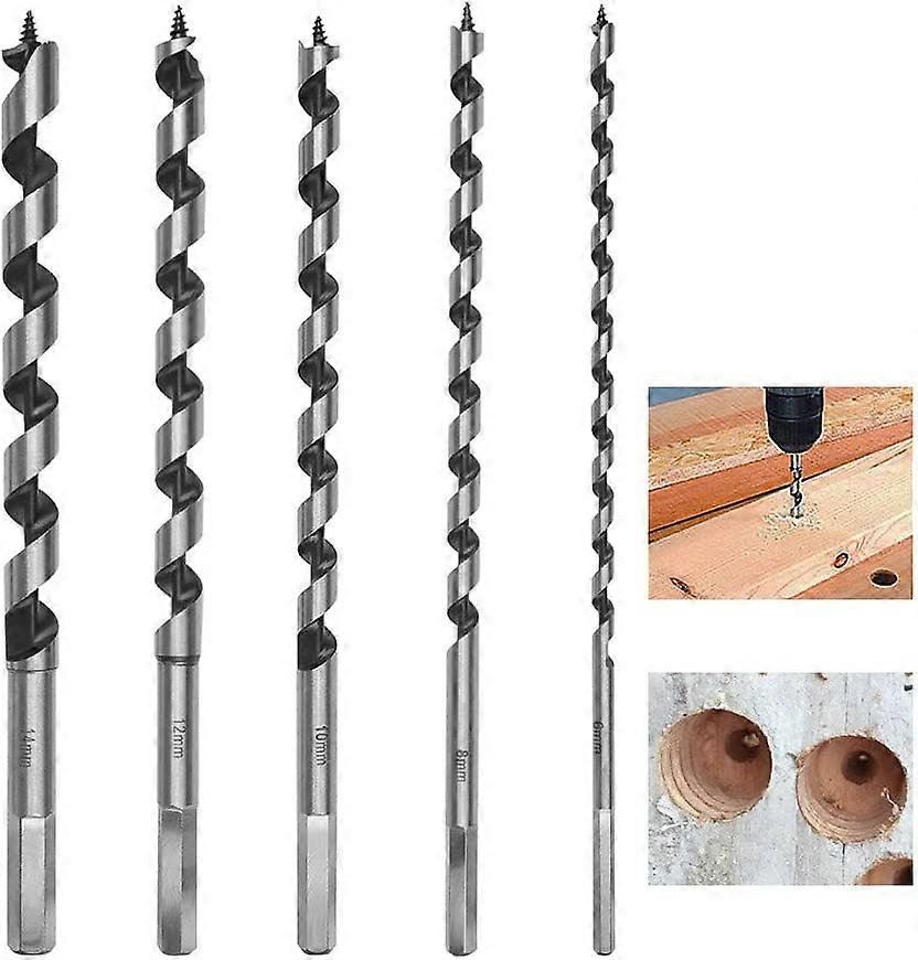 [5 Sizes for Your Various Needs]Therere 5 different diameters of auger drill bits, including 6mm, 8mm, 10mm, 12mm, 14mm. So you can choose the most suitable wood snake drill for the woodworking.[Hexagonal Shank Design] This design makes the hex shank wont slip during working, and the hex shank can be used with hand drills and bench drills. [Self-Directed Thread Head] The self-directed thread head of auger bits can help the drill bit be accurately and quickly positioned on the wood for easy drilling. [Central Solid&Wide Blade Auger Bit] The central solid design makes the drill bit stable and strong during the drilling, and the wide blade can provide faster drilling, easier chip removal and smoother hole walls. [High quality Helper for DIY] Made of high-carbon steel(65# ), these auger bits are rustproof and durable, and they can be used for processing all kinds of cork, hardwood and plastic materials.Theyre practical drilling tools for and woodworking lovers.