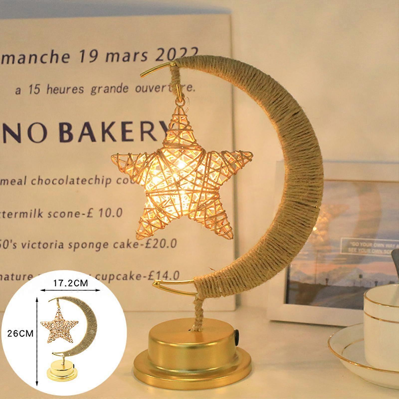 Material: metal + hemp rope, Product size: 26 * 10cm, power on USB, or put 3 AA batteries - not included Romantic Moon LampThis enchanted lunar lamp has a unique shape and looks very stylish and retro when lit. The star lampshade is woven in rattan for an added decorative sense. Not only can be used as a table lamp to create a warm atmosphere, but also can be used as Ramadan decorations, Christmas decorations and gifts. Caring EyesThe hanging Led Moon Lamp Night Light has aSoft and non-flickering design, the lighting is friendly to your eyes, helping you avoid eye fatigue caused by flickering light and harsh glare. Warm diffused light creates a uniform non won't hurt your eyes. Cozy light help soothe you and your kids to sleep as well. Ramadan inspired DesignImmerse yourself in the festive spirit with our LED moon table lamp. Featuring moon, star, round ball, and other decorative elements, it embodies the essence of Ramadan and religious symbolism, adding a touch of authenticity and beauty to your celebrations. Versatile for Various OccasionsSmall lamps for bedroom Ideal for celebrating Ramadan, Christmas, Easter, New Year, birthdays, and other festive occasions, our decorative lunar lamps joy and comfort. It complements the festive atmosphere and is an excellent addition to your Ramadan parties. Perfect GiftShare happiness and blessings at your Ramadan gatherings with our moon LED bedside lamp. It serves as a perfect gift for friends, neighbors, and family members, spreading joy and creating unforgettable memories.