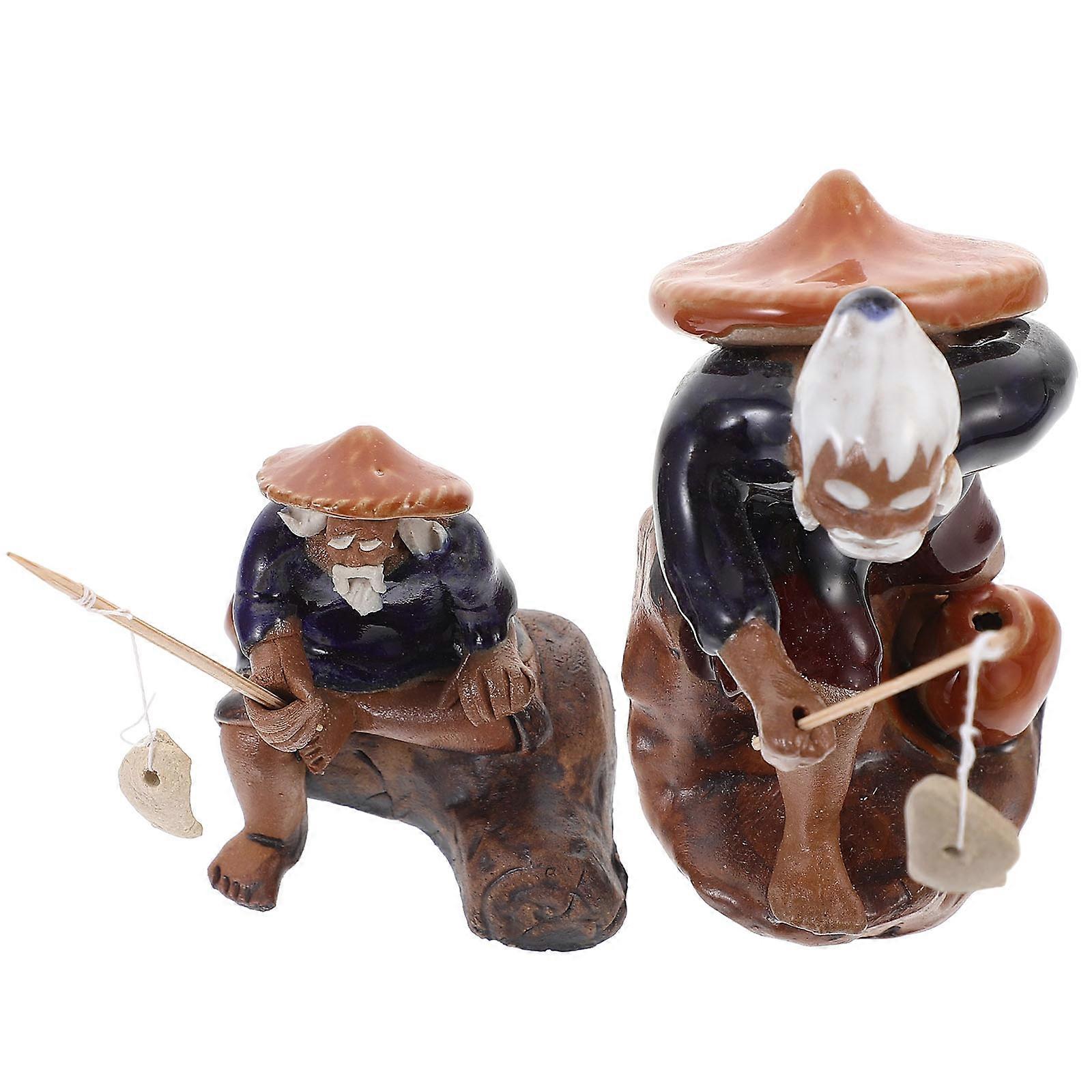 Mini Fisherman Statue Ceramic Vintage Collectors Rockery Decorations 7x4.5x5.5cm Decoration 2Pcs