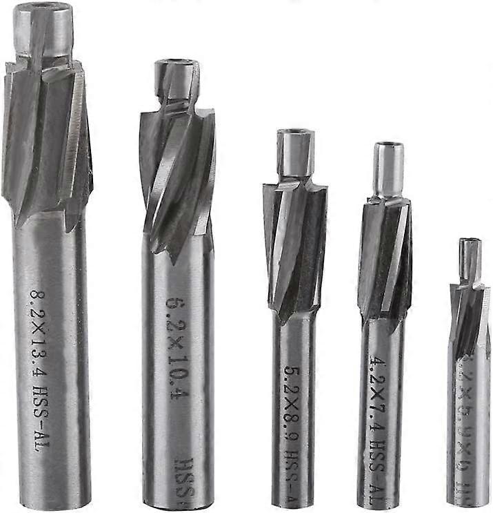 XIANQI [HSS Counterbore End Mill]: These end mill cutters are made of hard high speed steel, High toughness, abrasion resistance, high-speed cutting for the high hardness [Application]: Our M3-M8 professional counter bore bits are usually used to be assembled on milling machine; Suitable for milling of copper, aluminum, steel, cast iron, etc [Well Performance]: This counterbore set can processing directly or fine processing to the heat treatment mold [High Effective]: Reduces times of changing tools, improves machine actuator movement efficiency and save mold making time [5pcs/Set M3 M4 M5 M6 M8]: 5pcs M3-M8 countersink end mill cutters drill bits set 4 flute metal drilling slot drill bit woodworking pilot milling cutting tools set Specifications: color: as show Material: HSS-AL super-hard high speed steel Hardness: HRC65~68 Size:(Boot*Blade Diameter*Shank Diameter*Full Length) M3=3.2*5.9*6*45mm M4=4.2*7.4*6*48mm M5=5.2*8.9*6*51mm M6=6.2*10.4*8*58mm M8=8.2*13.4*12*67mm Weight: 128g(approx.) Package Includes: 5 x Countersink Mill Cutters