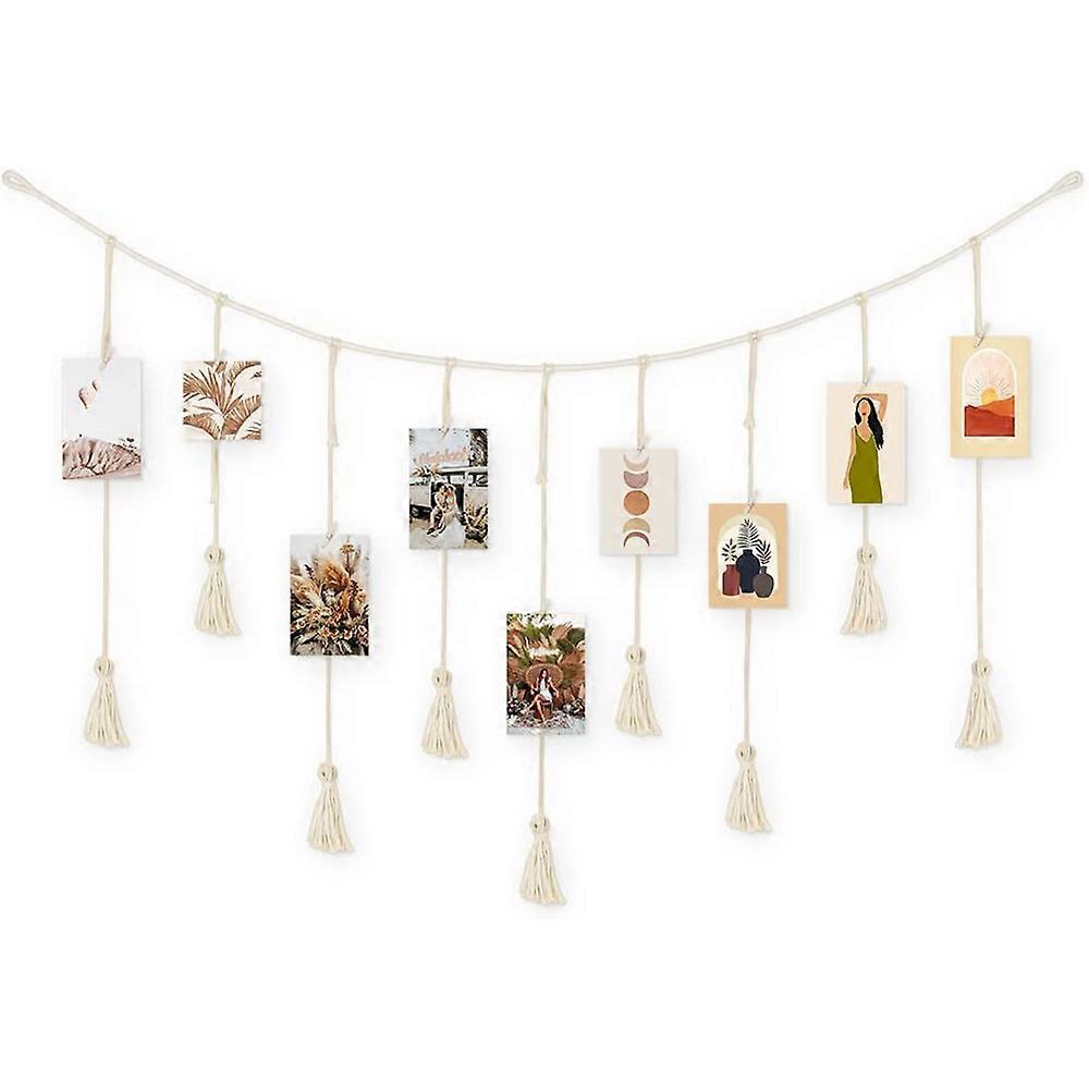 Macrame wall hanging with 9 tassels, boho photo holder with 20 clips, hand-woven cotton rope decor for bedroom, dorm, office or living room