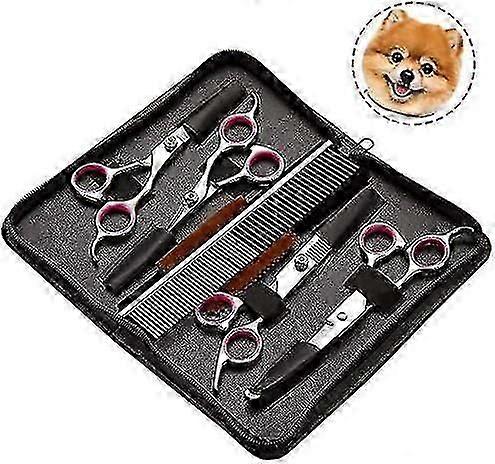 Package- 3Pcs Professional Dog/Cat Hairdressing Scissors (Up-Curved Scissor, Down-Curved Scissor, Trimming Scissor, Thinning Scissor) With Sharp Blades Which Are Able To Cut Coiled And Dead Hair, For Almost All Hair Types. Pet Breeds: Chihuahua, Husky, Pomeranian, Teddy And Scottish Fold, British Shorthair, Persian Cat, Etc.Mute Technology- Each Scissor Handle With A Mute Bead To Reduce Impact Sound, Don'T Worry About Your Pet Being Afraid Of Sharp Scissors, Easy To Trim Hair, Eyebrows, Hip, Leg And Paw Hair. The Scissors Rubber Not Only Can Reduce Noise To Prevent The The Pet Is Not Scared, But Also Avoids Hurting The Hand.Ergonomic And Comfortable - Ergonomic Ring Size 2 Diameter Fits Most Types Of Index Finger And Thumbs , Also Providing Pocket Feeling Comfortable, While The Pink Rubber Ring Is Removable To Fit For Bigger Fingers.Economical Tools- This Grooming Kit Is Available To Create Various Hairstyle For Your Pets, Helps To Reduce Expensive Cost On Beauty Care In The Pet Store, Better To Save Time, Effort And Money. Portable - Bonus Of A Comb (Massaging / Throwing Off Loose Hair / Straightening Hair In Bow), A Cleaning Cloth And A High-Quality Leather Case With An Elastic Band To Fix The Scissors, This Grooming Kit Is Super Portable Which Allows You To Easily Enjoy Pet Hairdressing At Any Time. Have a great time shopping!