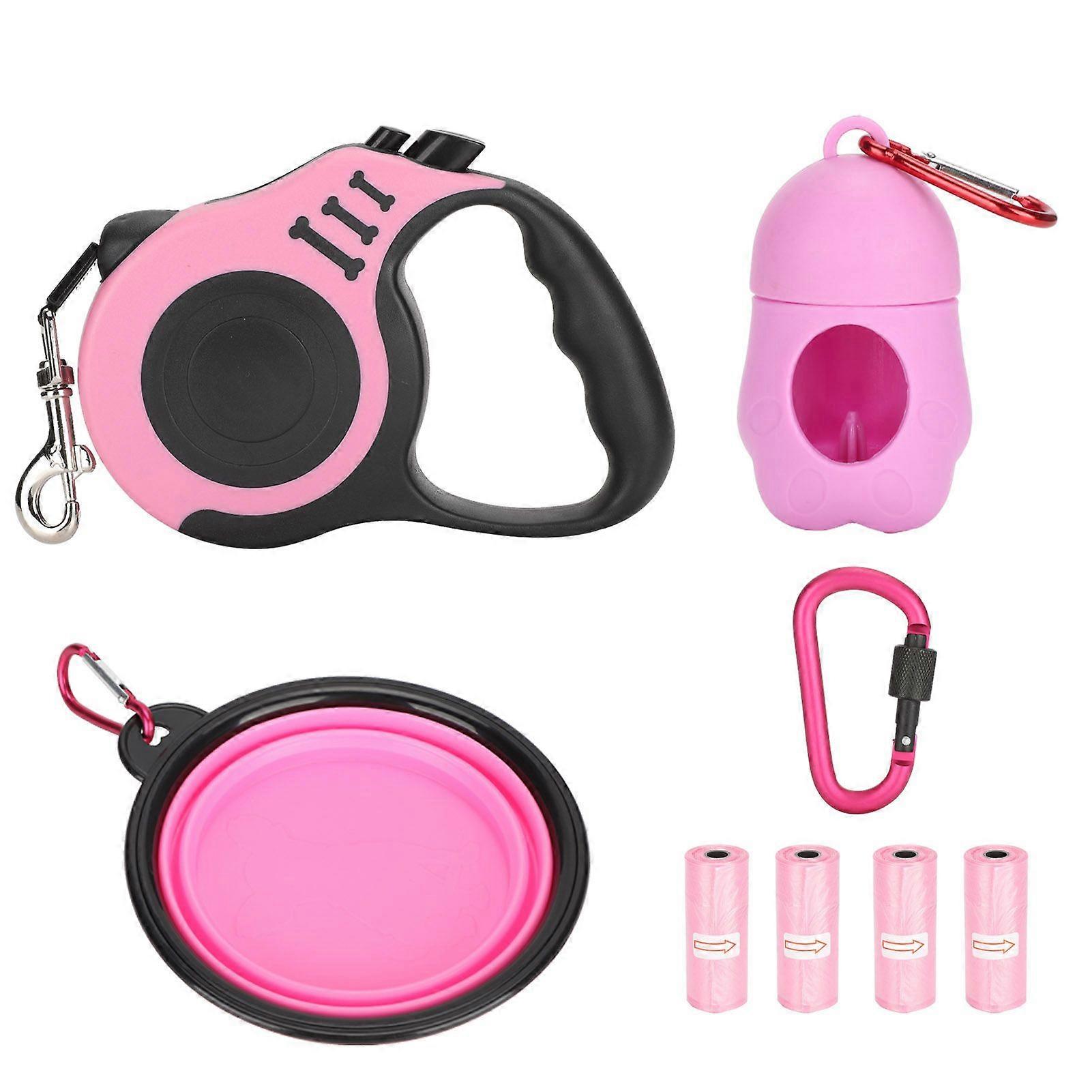 Lightweight 5M Retractable Dog Leash with Folding Bowl Dispenser Rubbish Bags BucklePink