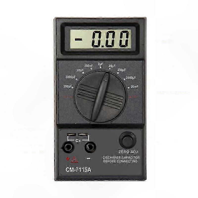 Battery: Not included Static current is approximately 4mA High measurement accuracy Compact design, portable and easy to carry Measurement system: Dual-slope integrated A/D converter Display mode: LCD display Capacitance range: - 200pF ± (0.5% + 6) - 2nF / 20nF / 200nF / 2μF / 20μF / 200μF ± (0.5% + 1) - 2000μF ± (1.0% + 1) - 20mF ± (2.0% + 1) Test frequency: 800Hz, 80Hz, 8Hz Maximum display: 1999 counts (3 1/2 digits) with automatic polarity indication Measurement rate: Updates every 2–3 seconds Over-range indication: Only "1" displayed when out of range Operating temperature: 0°C to 40°C, less than 80% RH Storage temperature: -10°C to +50°C, less than 70% RH Fixture size: Jaw opening 25mm, inner diameter 35mm Application: Multimeter Product model: CM7115A Main keyword: Digital capacitance meter Color: Black Material: Plastic Size: Approximately 128 x 42 x 35mm Package contents: 1 x Digital Multimeter 1 x User Manual 2 x Test Leads Note: The package includes only the items listed above. Other accessories are not included. Note: Lighting and display differences may cause slight color variations between the image and the actual item. Measurement error allowance is +/- 1-3cm.