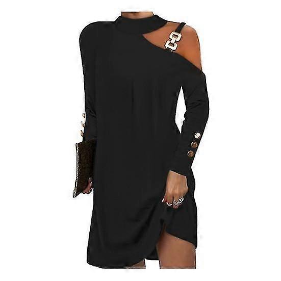 Women Dress Chain Decor One Shoulder Long Sleeve Solid Color Loose Halter Neck Soft Breathable Above Knee Length Mini Dress
