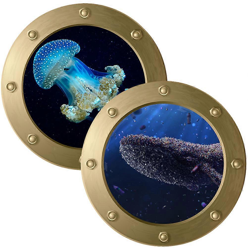 Ocean World Wall Stickers 2PCS Vivid Sea Life Art with Strong Adhesive, Porthole Design for Living Room and Bedroom Decoration