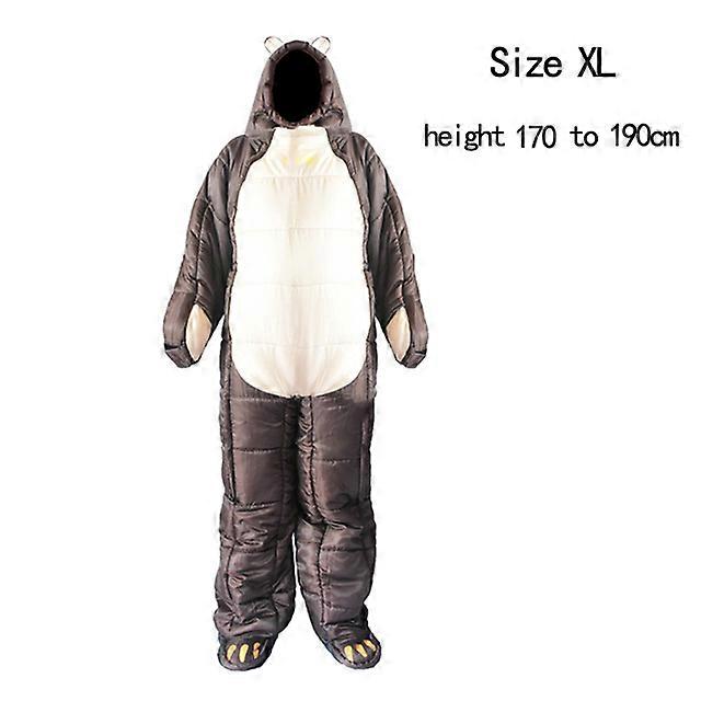 Suitable for Comfort temperature 0 to 5 CIt's very warm in winter Brown bear rice white belly ears and claws naive lifelike. Double-row zipper structure can be pulled down below the crotch easy to wear and take off. Humanized designHands feet can be exposed. Thicken the brim of the cap. The brim is thickened with cotton clip to prevent cold and wind Dislocation design convenient for you to take things It can be rolled up and glued on with magic tape allowing free arm movement. Hand free Arm free Leg free Foot free. Fabric: 210T Waterproof polyester Filling material: imitation hollow cotton Approximate weight: Size M 1.7kg Size L 1.8kg.Size XL 1.9kg. Size M length about 190cm suitable for people height 150 to 168cm ?Size L length about 200cm suitable for people height 160 to 175cm ?Size XL length about 210cm suitable for people height 170 to 190cm Comfortable Temperature Scale:[5~0] Single/Double Sleeping Bag:Splicing Single Sleeping Bag Applicable People:Adult Length:Standard (Suitable for 1.8 m Height and Below) Origin:CN(Origin) Season:Spring & Autumn Season:Winter Size:S M L Model Number:B1-430 Type:3 Season Sleeping Bag Temperature Scale Category:Winter Sleeping Bag is_customized:Yes Category:Cotton Sleeping Bag Filling:Cotton Fabric:Terylene Style:Mummy