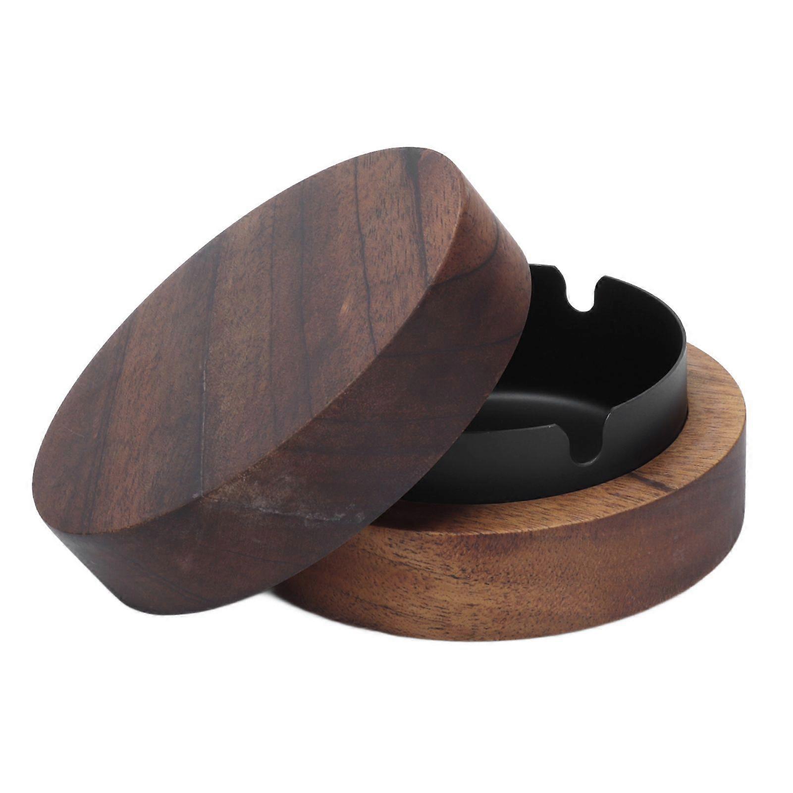 Wooden Compact Ashtray with Lid Stainless Steel Liner Innovative Windproof Cigarettes Ash Tray for OfficeBlack