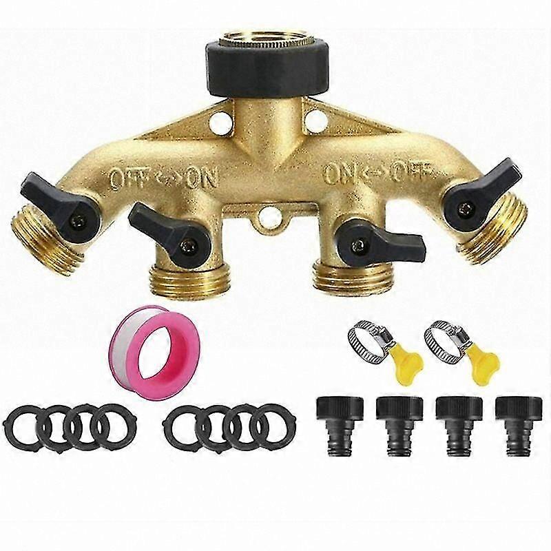 4-Way Brass Tap Connector with Y-Style Hose Splitter and Outlet Valves for Water Distribution