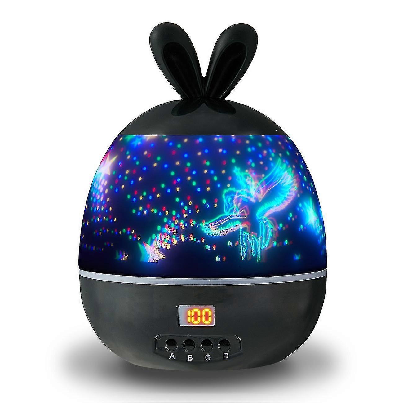 Description Product description Material: PVC Color: pink, white, black Input Voltage: DC 5V 1A Body material: ABS materials Light source: 3 LED Lights Product Size: 13.5*13.5*18cm Power Requirements: USB Cable (included) / 4x AAA batteries (not included) 1.Projection lamp Led star projector, It creates a relaxing galaxy environment to open kids imagination. Sound machine is helpful for sleep. The rabbit night light with warm white color is attractive to kids also, much more cute 2.360 Rotation : The rotating makes our star projector vivid and more interesting. It can be static with white noise if the rotation is not needed. 3. Better character for Kids: Enjoy sleeping under the stars, create a relaxing environment, a great night light for kids who are scared of the darkness. It works by sparking your kids into imagination, thereby making them relaxed and become brave. The sleeping time is 100% important for a kids growth and character shaping. 4.BEST GIFT This night light is a perfect gift for a kids bedroom. Its also ideal for decorating events with colorful projected stars. For instance, you can use it to decorate a wedding, birthday party, or even use it during Christmas. You can also use it as a romantic night lamp or as a decorative night light lamp. 5.2 WAY OF THE BATTERY It can be powered using two different power sources, either through a USB connection or use the 4*AAA Battery powered. Note: 4 AAA batteries are not included.