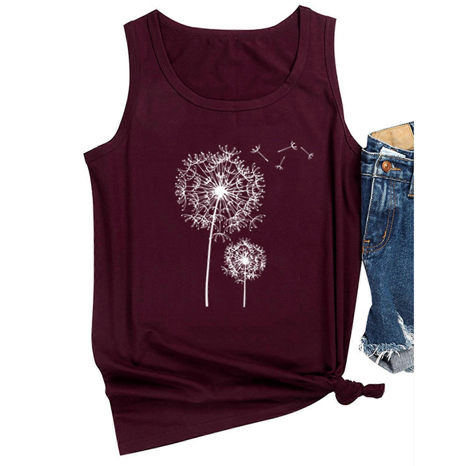 Women Crew Neck Tank Top Summer Cute Graphic Flying Flower Print Cami Shirts Casual Loose Solid Color Sleeveless Blouse Claret XL