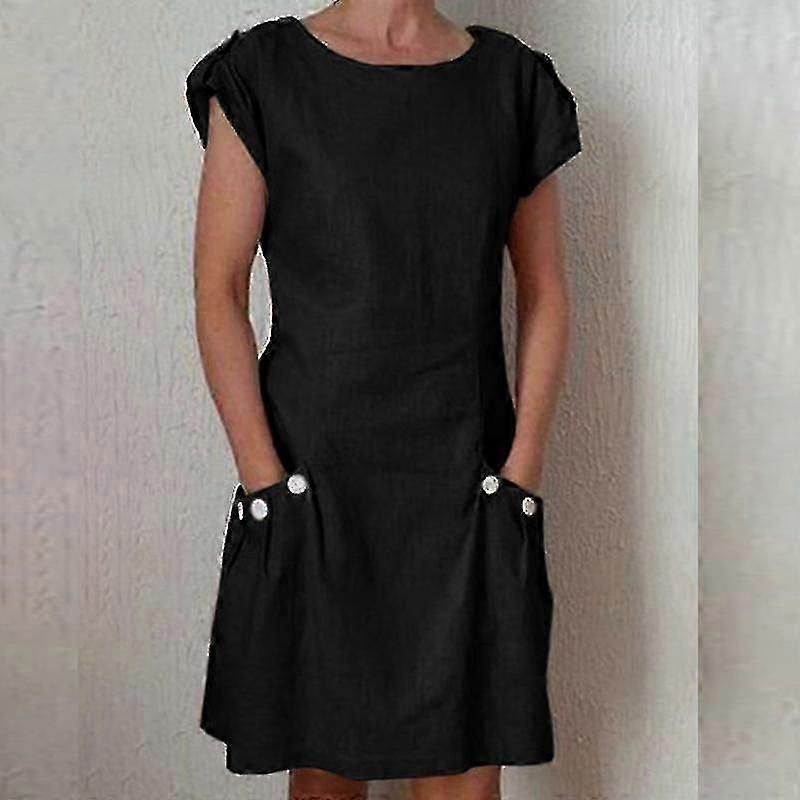 Women's Summer Boho Mini Dress - Crew Neck, Buttons, Double Pockets, Short Sleeve