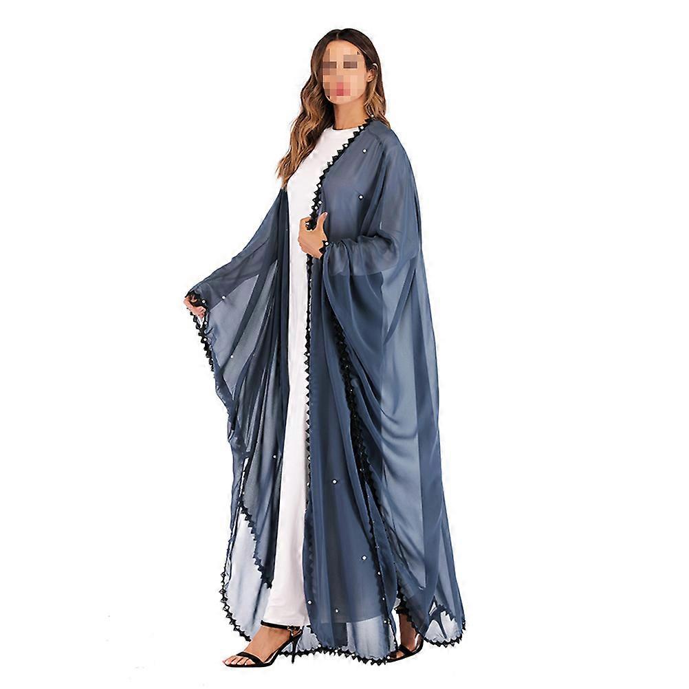 Women Dress Abaya Coat Lace-Up Patchwork Beaded Stitching Grey Free Size 1Set