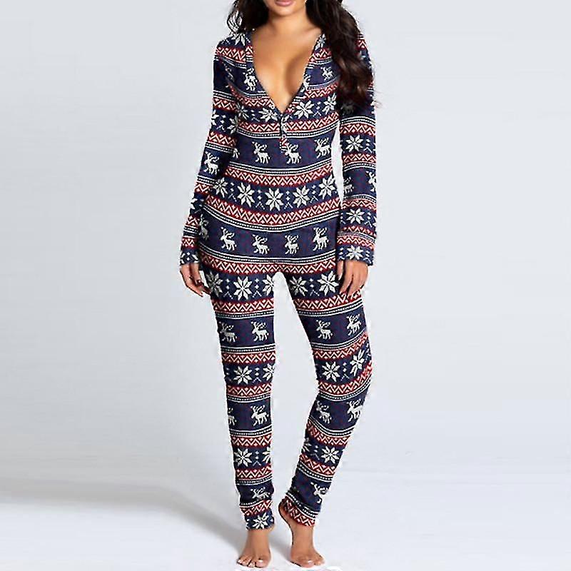 Women's One Piece Print Sleepwear Christmas Pajamas Jumpsuit Rompers Long Sleeve Nightwear