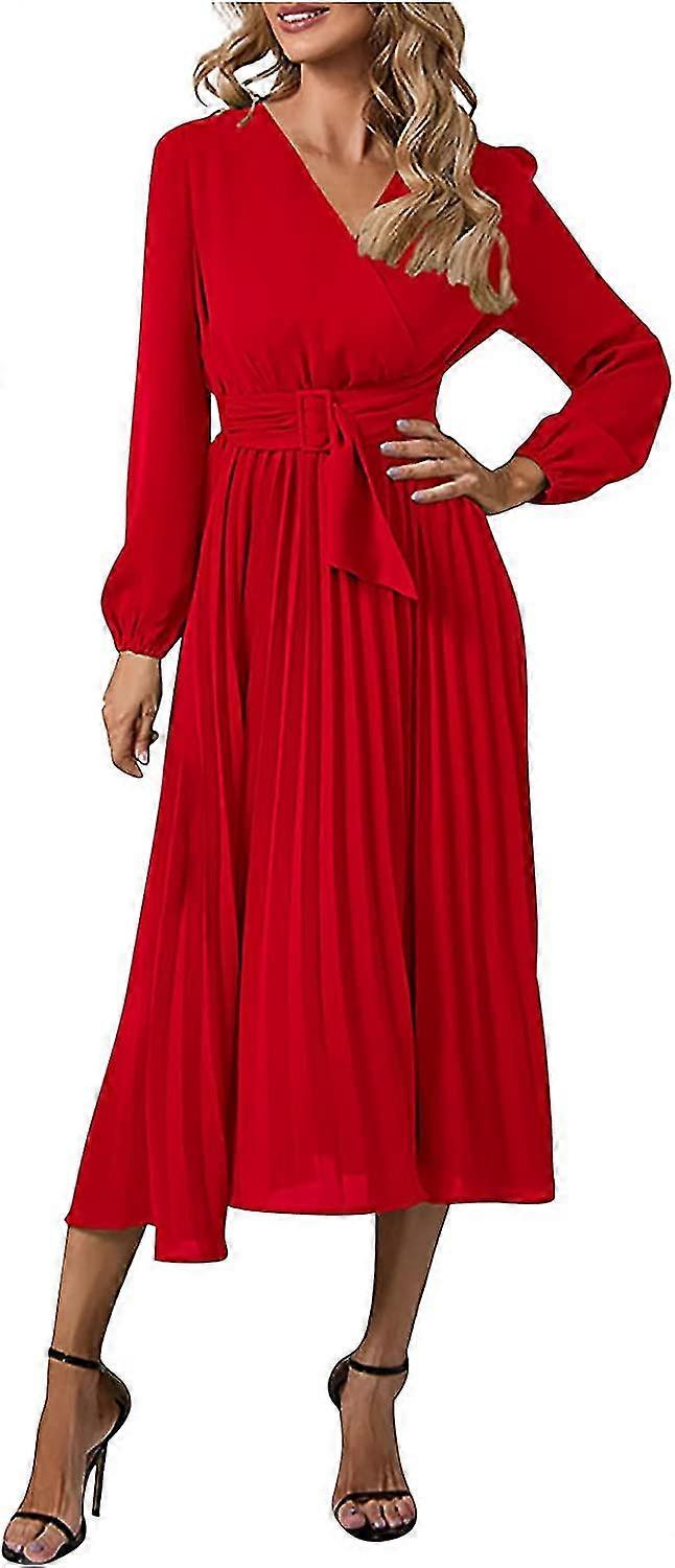 Women's Casual Es Long Sleeve Slim Fit Pleated Belt V-neck Elegant Fall Clothes S-2xl