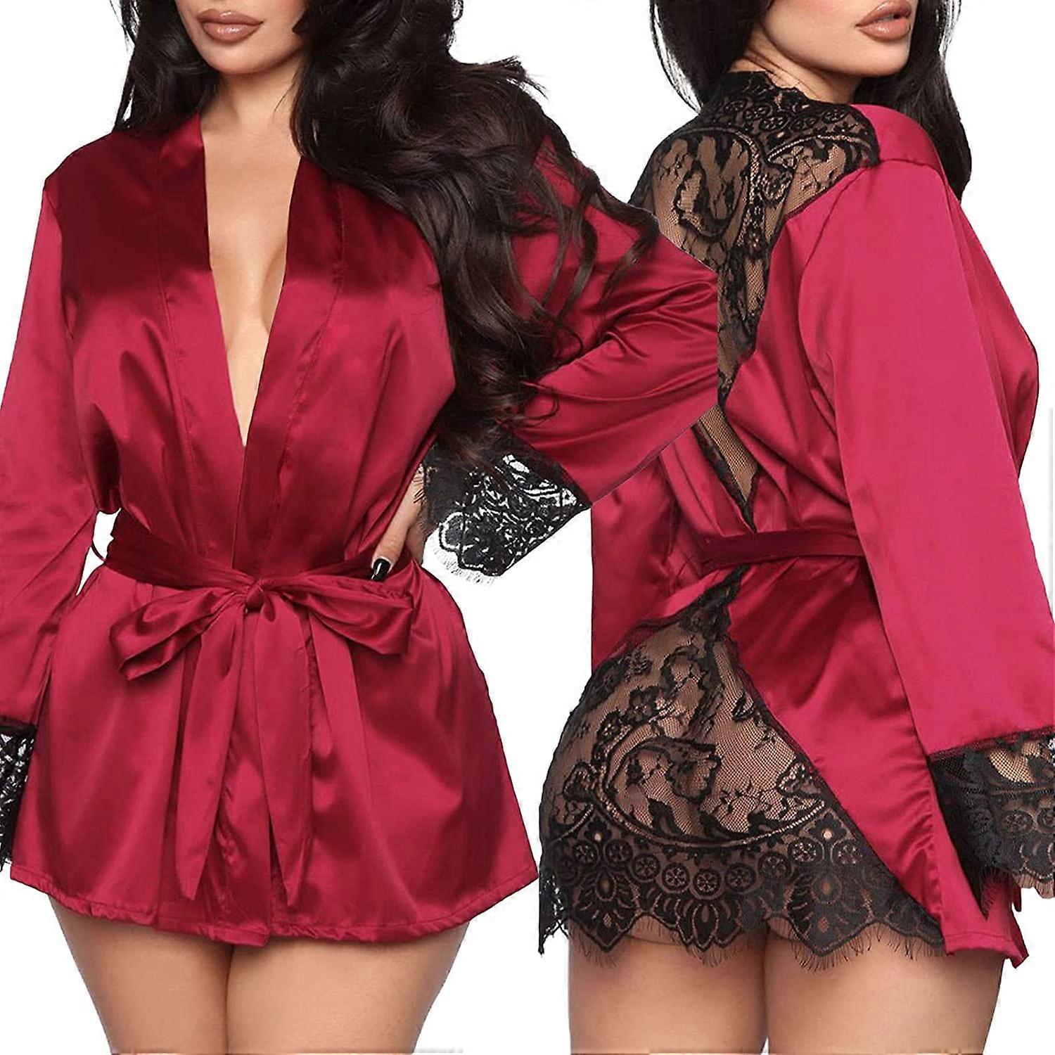 Women's Sexy Satin Kimono Robe - Long Sleeve Lace Silk Short Robes Bridesmaid S-3XL