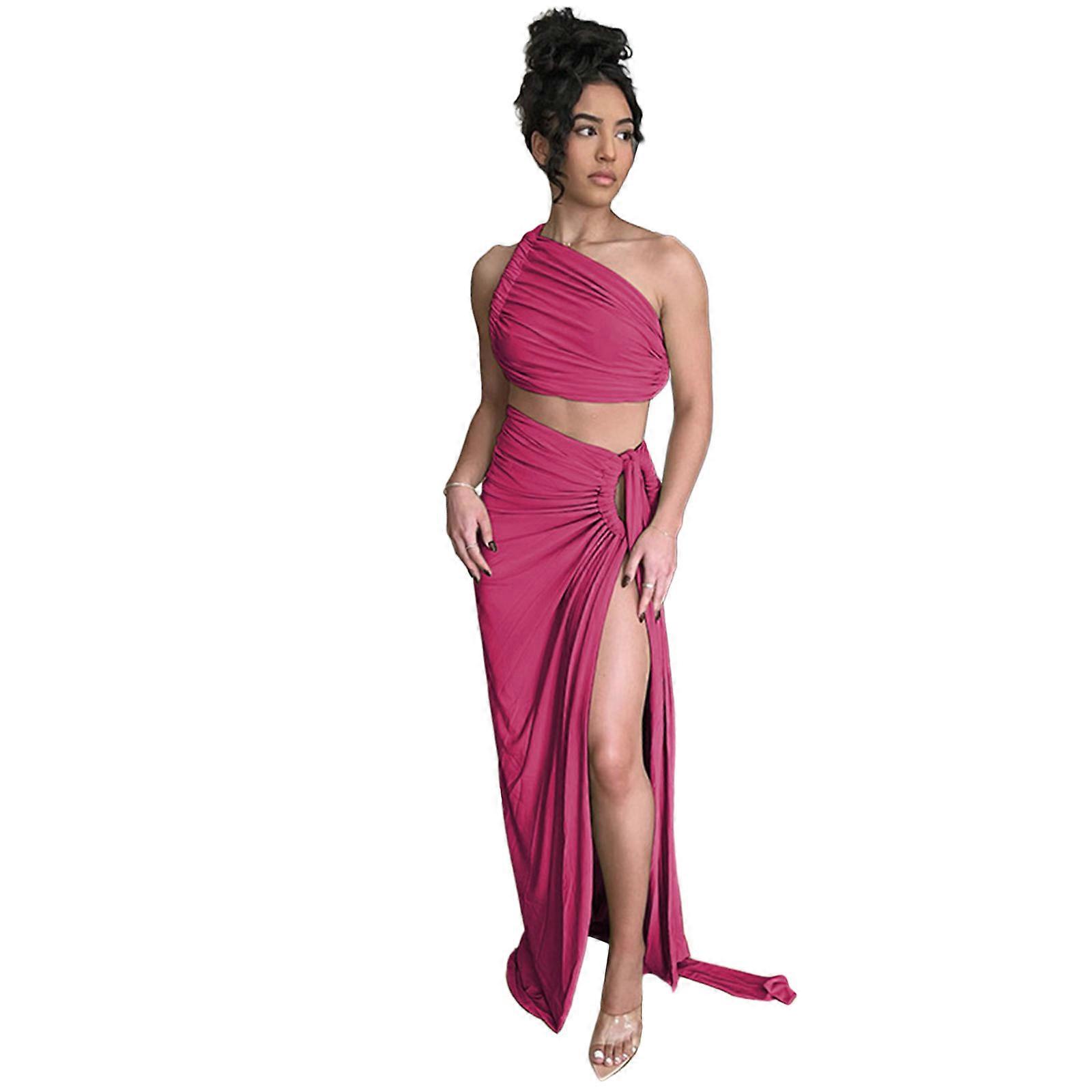 Womens 2Pcs Sleeveless One Shoulder Backless Crop Tube Top and Bandages Thigh Split Maxi Skirt Set Solid Ruched Outfit rose Red S