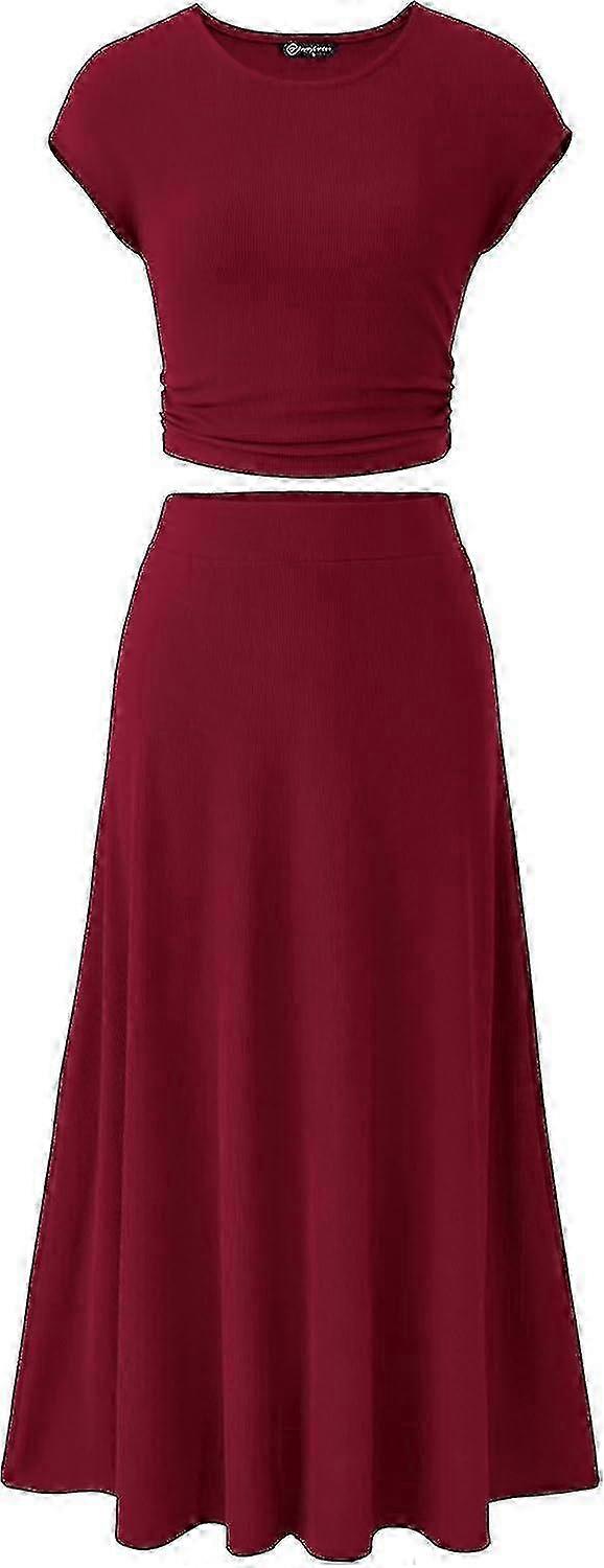 Women's 2 Piece Summer Outfits Dressy Casual Knit Short Sleeve Crop Top High Waist Midi Skirt Set
