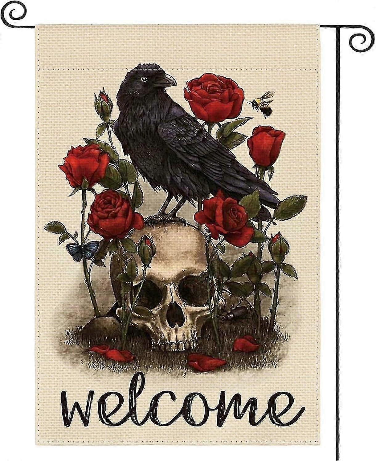 Halloween Welcome Skull Rose Crow Garden Flag Double Sided, Day Of The Dead Holiday Yard Outdoor Decorative Flag 12 X 18 Inch