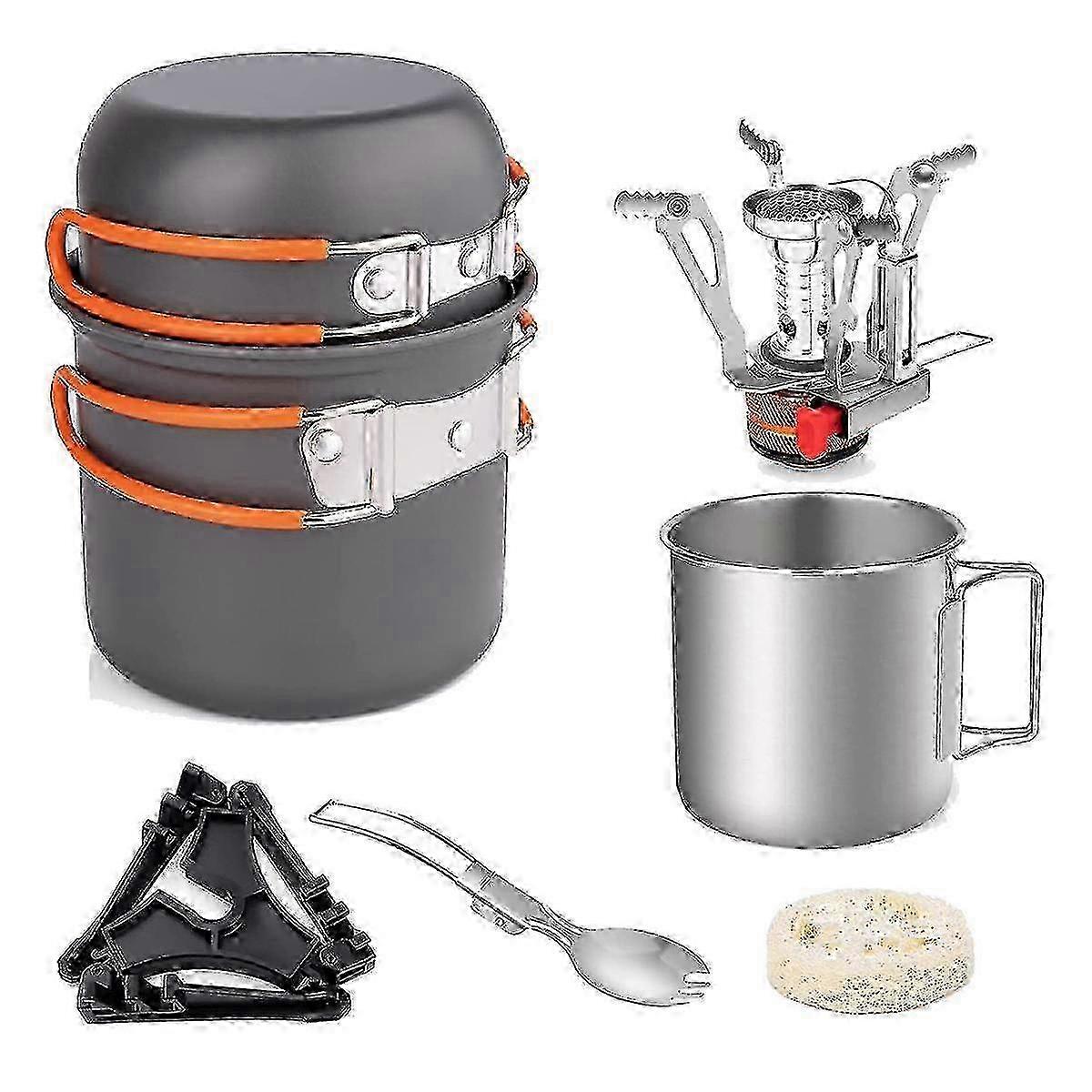 Camping Pot And Pan Set With Mini Backpacking Stove Cooking Gear For Outdoor Hiking Campfire Orange