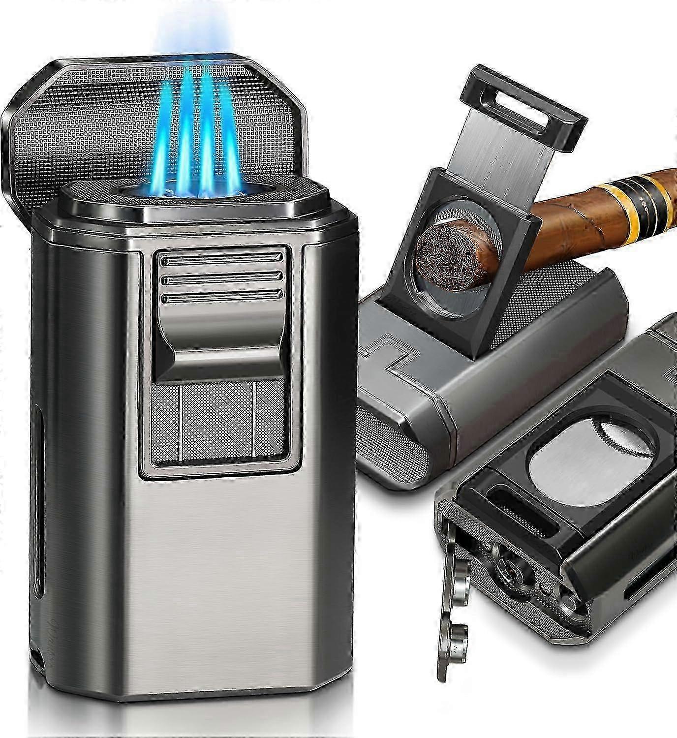 Cigar Lighter and Cutter, Powerful 4 Jet Flame Torch Lighters, with Punch Built in, Big Holder, Cigar lighters Set, Thanksgiving Christmas Day Gi